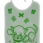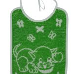 Dětský bryndák kočička zelená na zavazování. Materiál: 100% bavlna froté. Praní: na 90°C. Rozměr: 25 x 35cm.