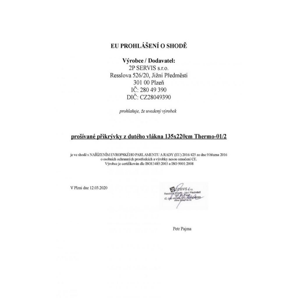 Prošívané přikrývky z dutého vlákna Thermo-01/2 jsou luxusním provedením přikrývek s použitím velmi kvalitních alergicky neutrálních materiálů. Důraz je u přikrývek kladen především na tepelně-izolační vlastnosti. Použitá výplň udílí přikrývkám vyšší hřejivost i při střední objemovosti a dále příjemnou měkkost, vzdušnost a stálou nadýchanost. Materiál: vrchní vrstva – prošívané mikrovlákno, výplň – dutá silanizovaná prostorově tvarovaná polyesterová vlákna 1.450g. Rozměr: 135 x 220cm.