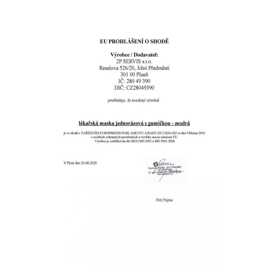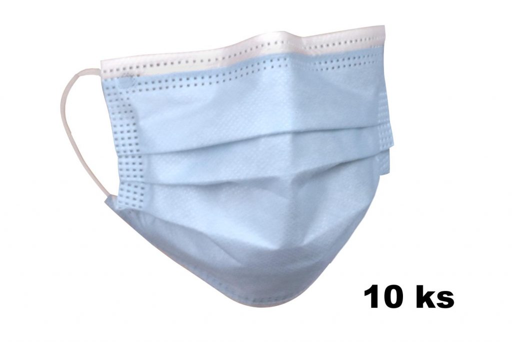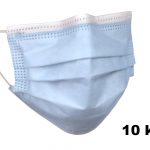 Zvýhodněný set 10 kusů roušek/ústenek modré barvy. 3 vrstvy vyrobené z lehké a měkké antialergické netkané textilie, díky čemuž jsou ústenky optimálně prodyšné, odpuzující kapaliny, gumičky za uši bez obsahu latexu, nosní tvarovací vložka. Výroba: probíhá v souladu s normou EN 14683:2019 + AC: 2019-09 – Type II, Třída I, BFE 98%, směrnice 93/42/EHS. Balení: 10 kusů v balení. Velikost: 9 x 17,5cm. Složení: 3 vrstvy: spunbond PP 18g/m2, meltblown PP 25g/m2, spunbond PP 18g/m2.