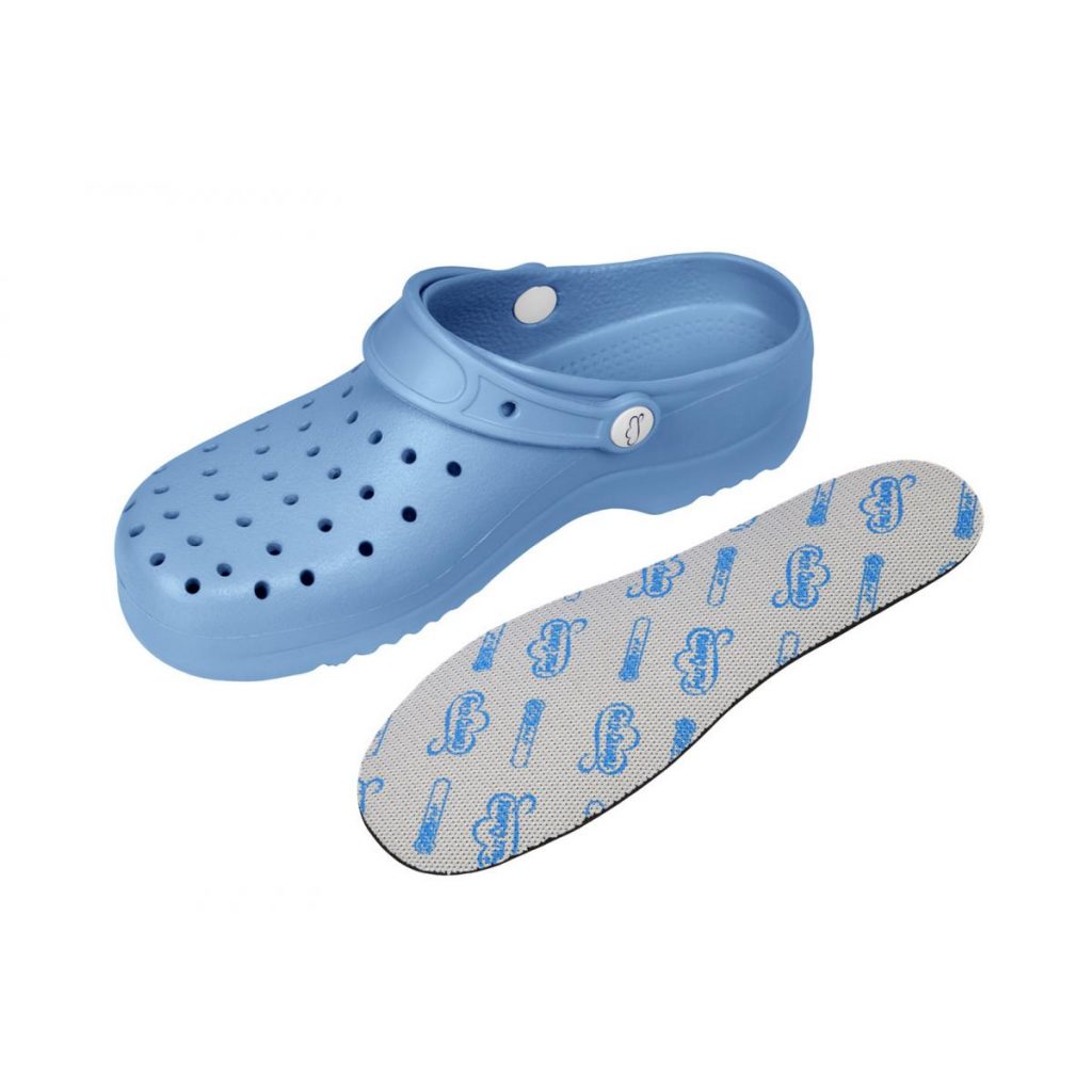 Gruyer modrá je ultralehká zdravotnická obuv s protiskluznou podešví OB + SRC +  E. Obuv je vhodná pro dlouhodobé nošení, kdy pomáhá snižovat svalovou únavu nohou. Díky použitým materiálům a konstrukci je bezpečná, poskytuje vysokou úroveň komfortu a vysoký stupeň pevnosti. Obuv se přizpůsobí chodidlu, absorbuje nárazy, eleminuje rizika a pády v důsledku uklouznutí a nabízí maximální pohodlí. Obuv má překlopný patní pásek a ergonomické tvarování. Materiál: 100% EVA bez latexu. Normy: UNE-EN ISO 20347: 2012 Standard OB + SRC + E (úroveň ochrany a protiskluzovosti). Certifikace: štítek INESCOP REACH (zaručena nepřítomnost nebezpečných látek regulovaných EU, zajištění ochrany uživatele a životního prostředí). Značení: Podle charakteristik definovaných ve směrnici 89/686 / ES.