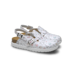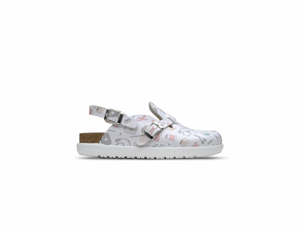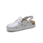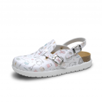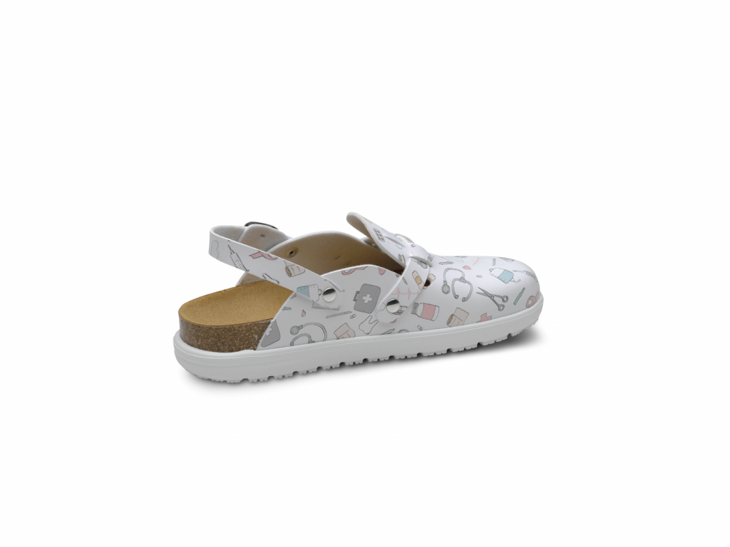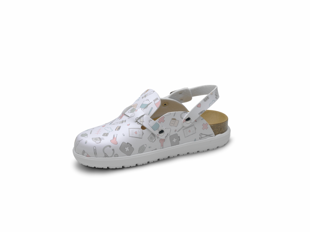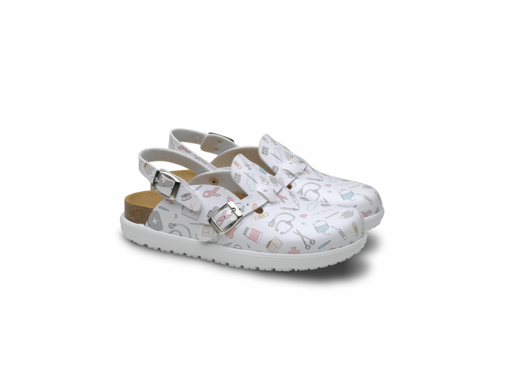 Korkové pantofle nemusejí být vždy jen fádní, představujeme vám pantofle, určené hlavně pro zdravotnický personál, s jemnými, ale veselými obrázky. Pantofle Bio Vega Sanitario jsou vyrobené ve Španělsku z recyklovaného materiálu Eco-T. Obuv je unisexová, takže se šikne ženám i mužům. Protiskluzová, bílá podrážka nezanechává na podlaze stopy a navíc si můžete být jisti každým krokem i na kluzkém povrchu. Antibakteriální, korková stélka je anatomicky tvarována. Nártová část je voděodolná s nastavitelným páskem. Váš krok v těchto pantoflích bude tichý, pevný a lehký, každá bota totiž váží jen cca 240g. Bezpečnost zvyšuje nastavitelný patní pásek.