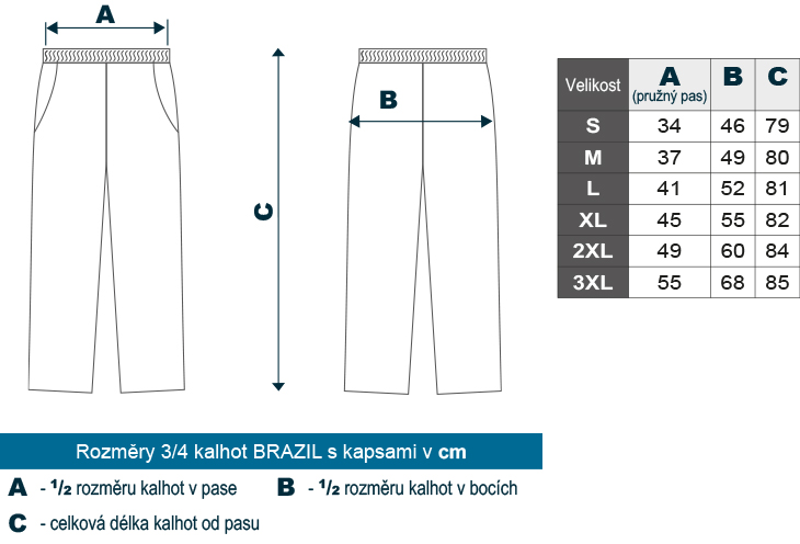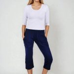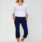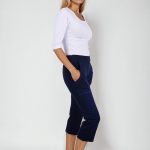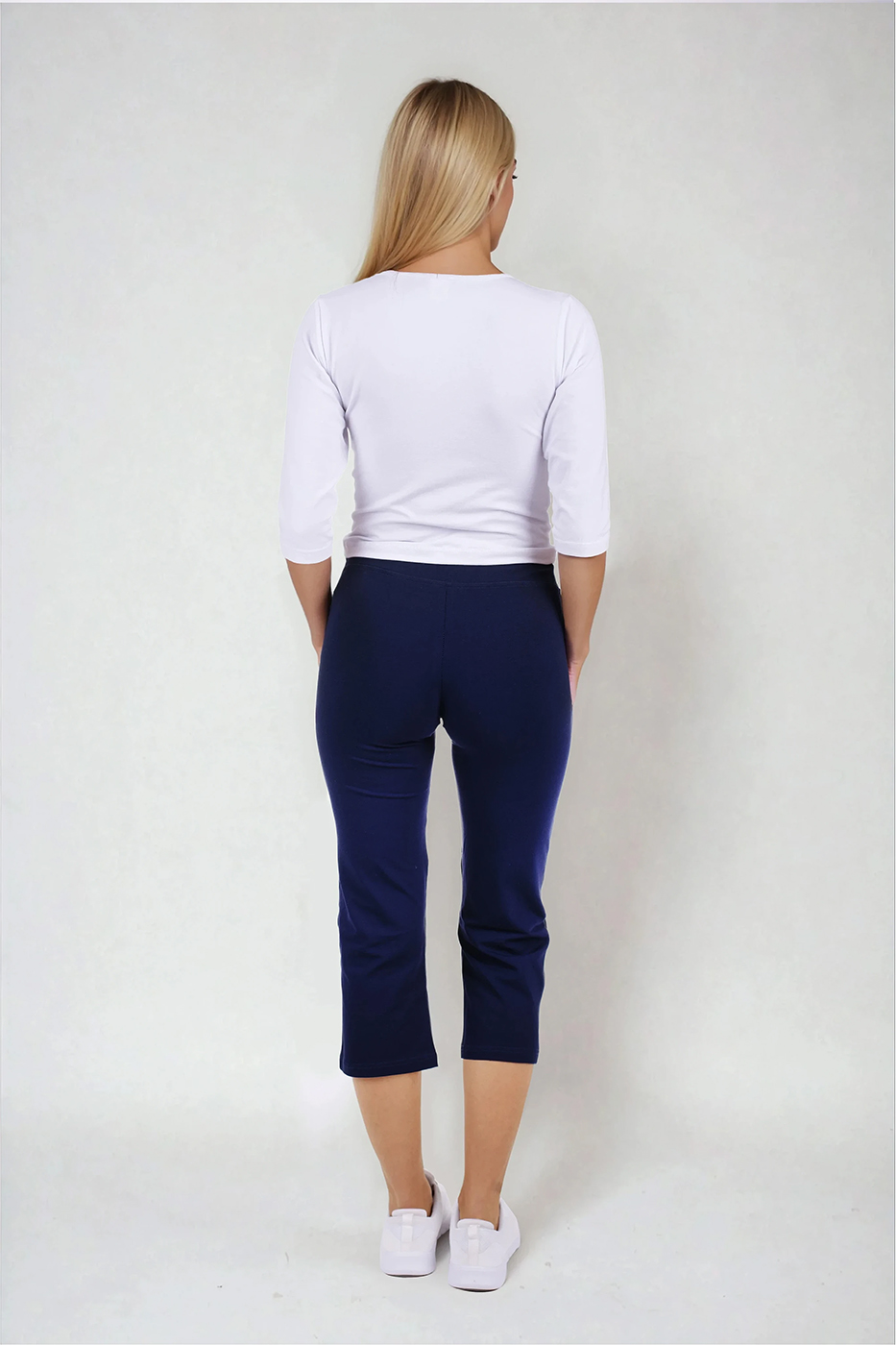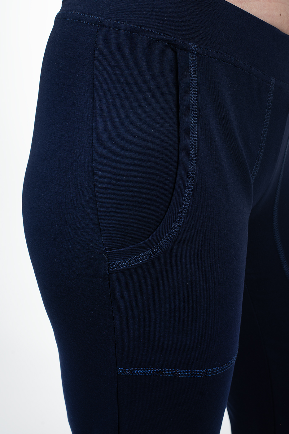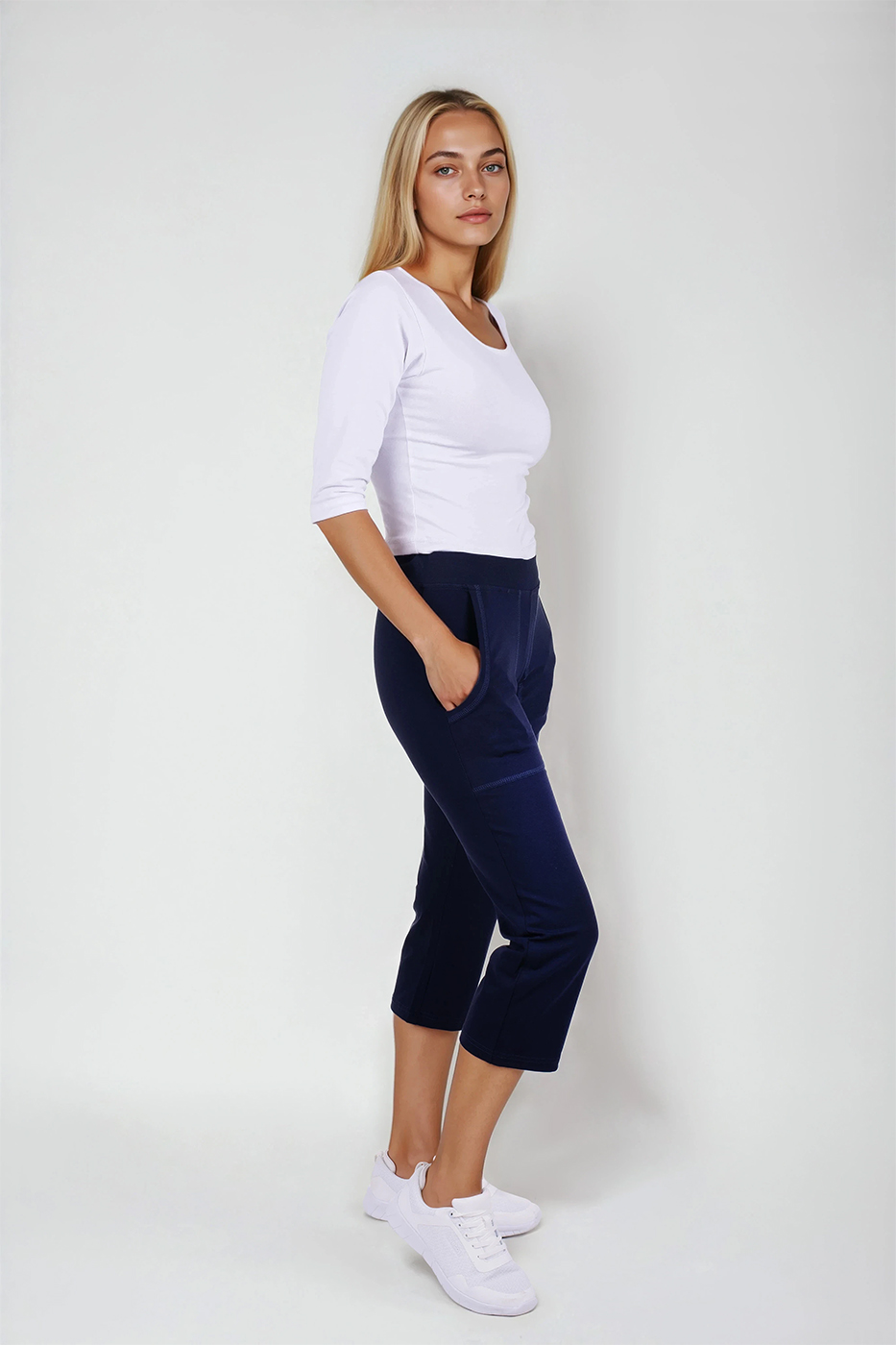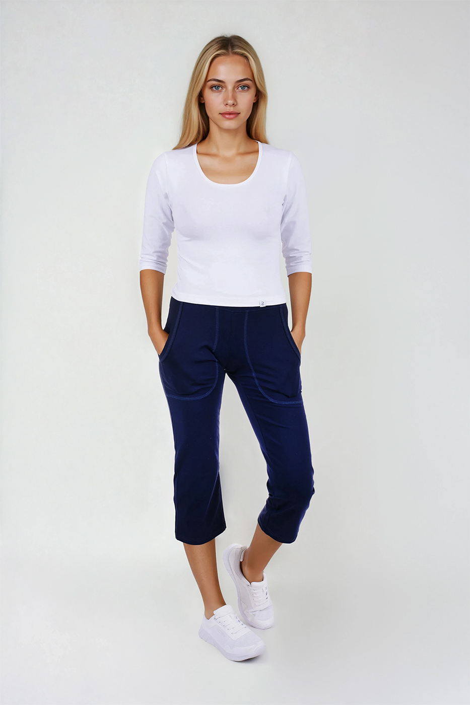 3/4 elastické kalhoty Brazil tmavě modré dámské s nakládanými kapsami, vypasované, z velmi příjemného a zdravotně nezávadného směsového materiálu.