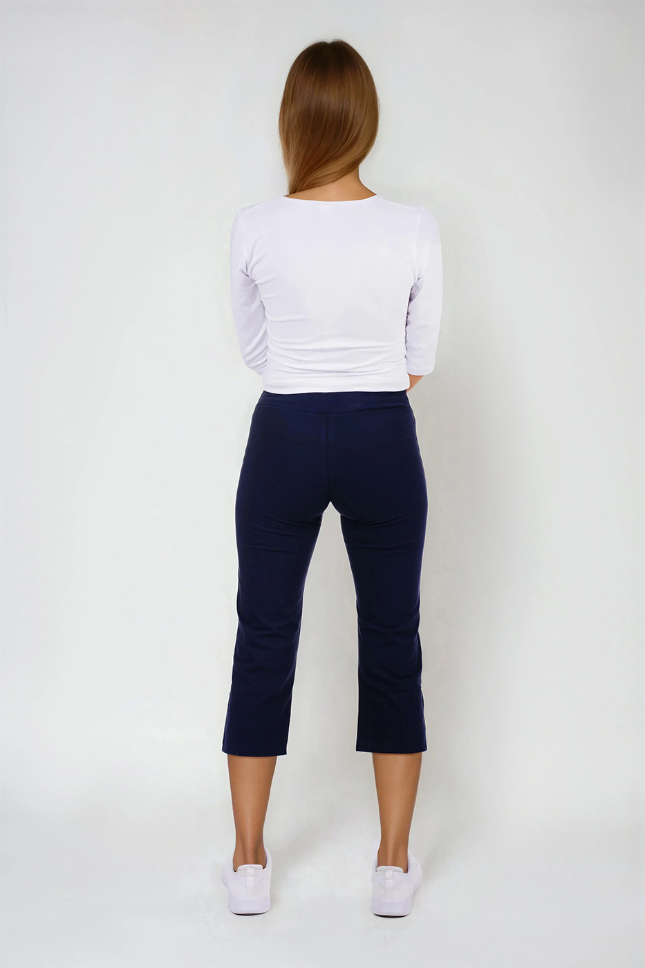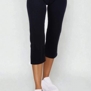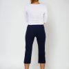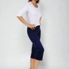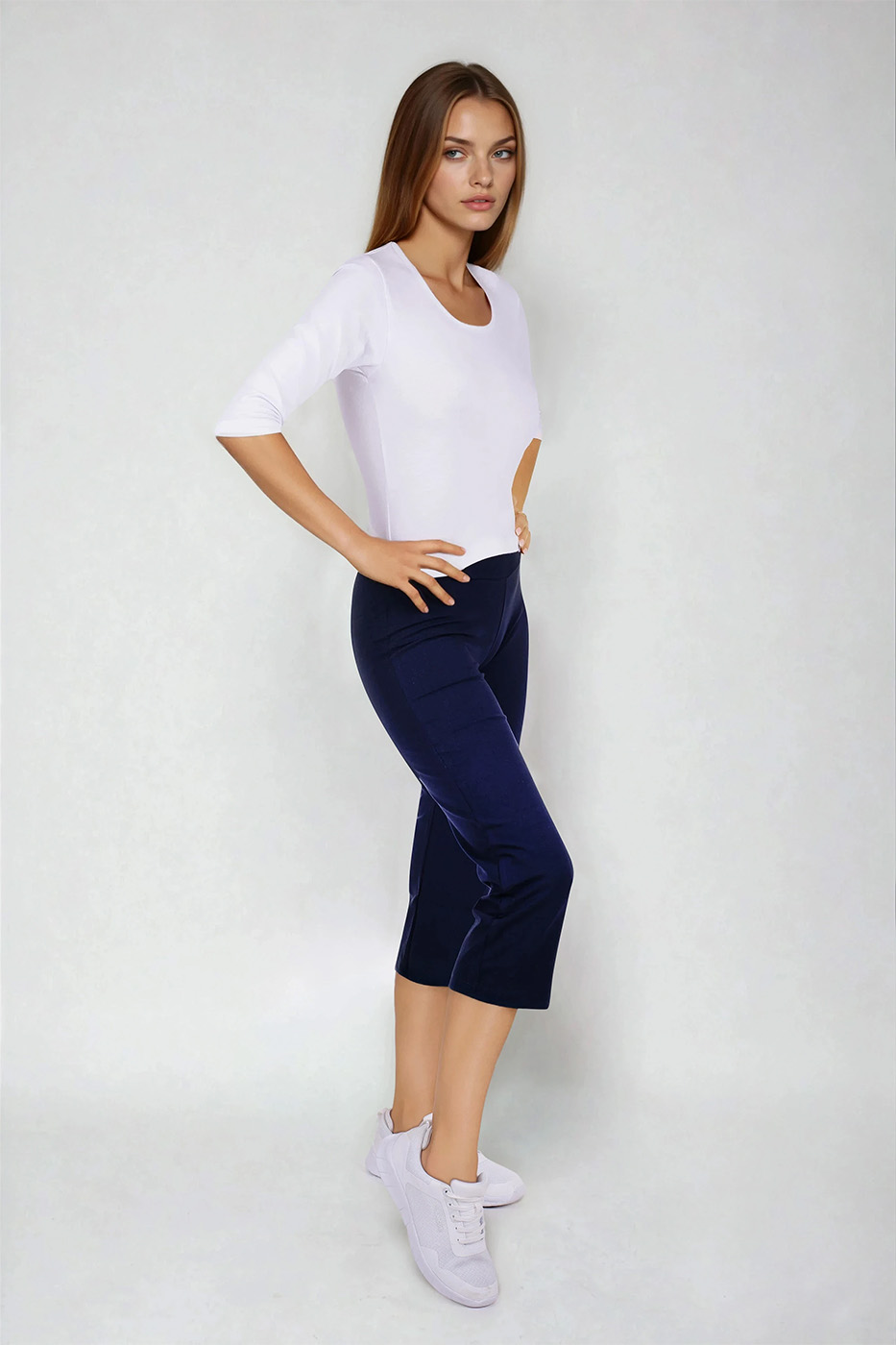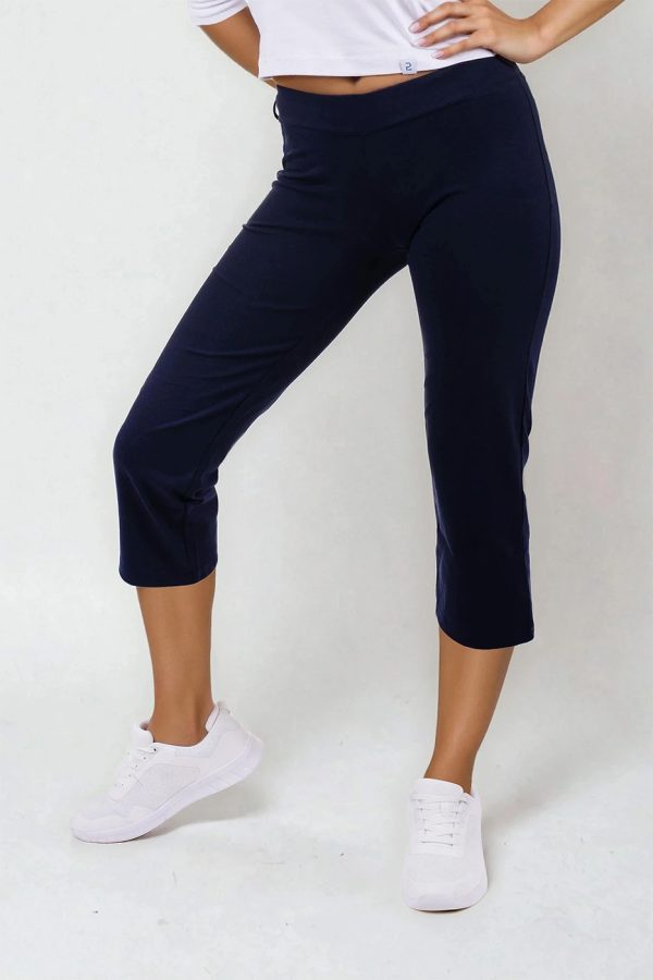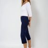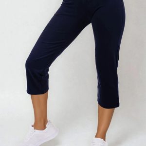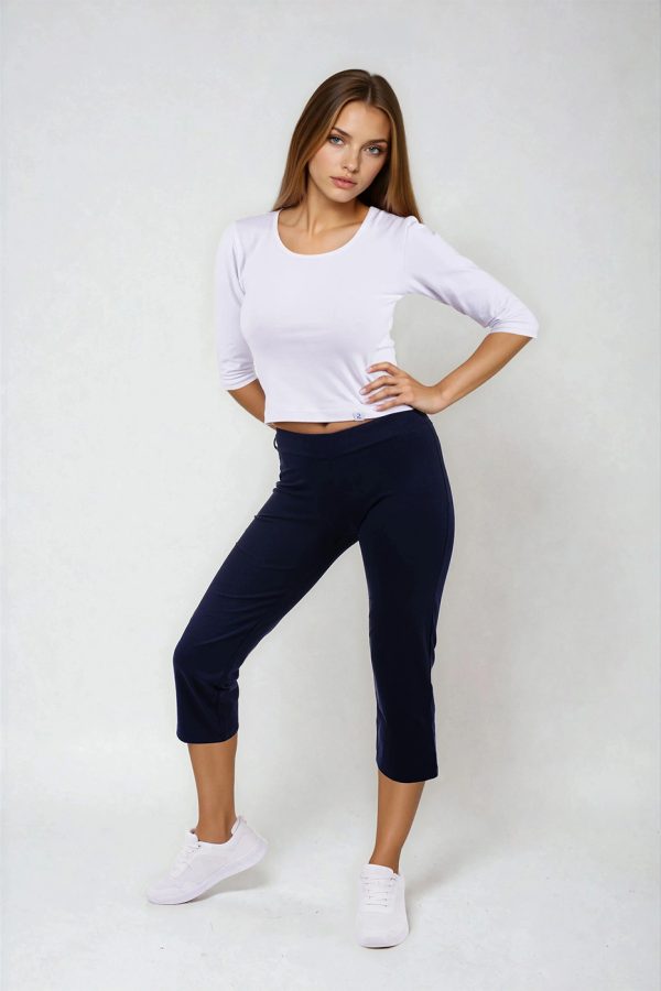3/4 elastické dámské kalhoty Brazil v tmavě modré barvě, s vypasovaným střihem, z velmi příjemného a přitom zdravotně nezávadného směsového materiálu.- velmi příjemný a zdravotně nezávadný materiál