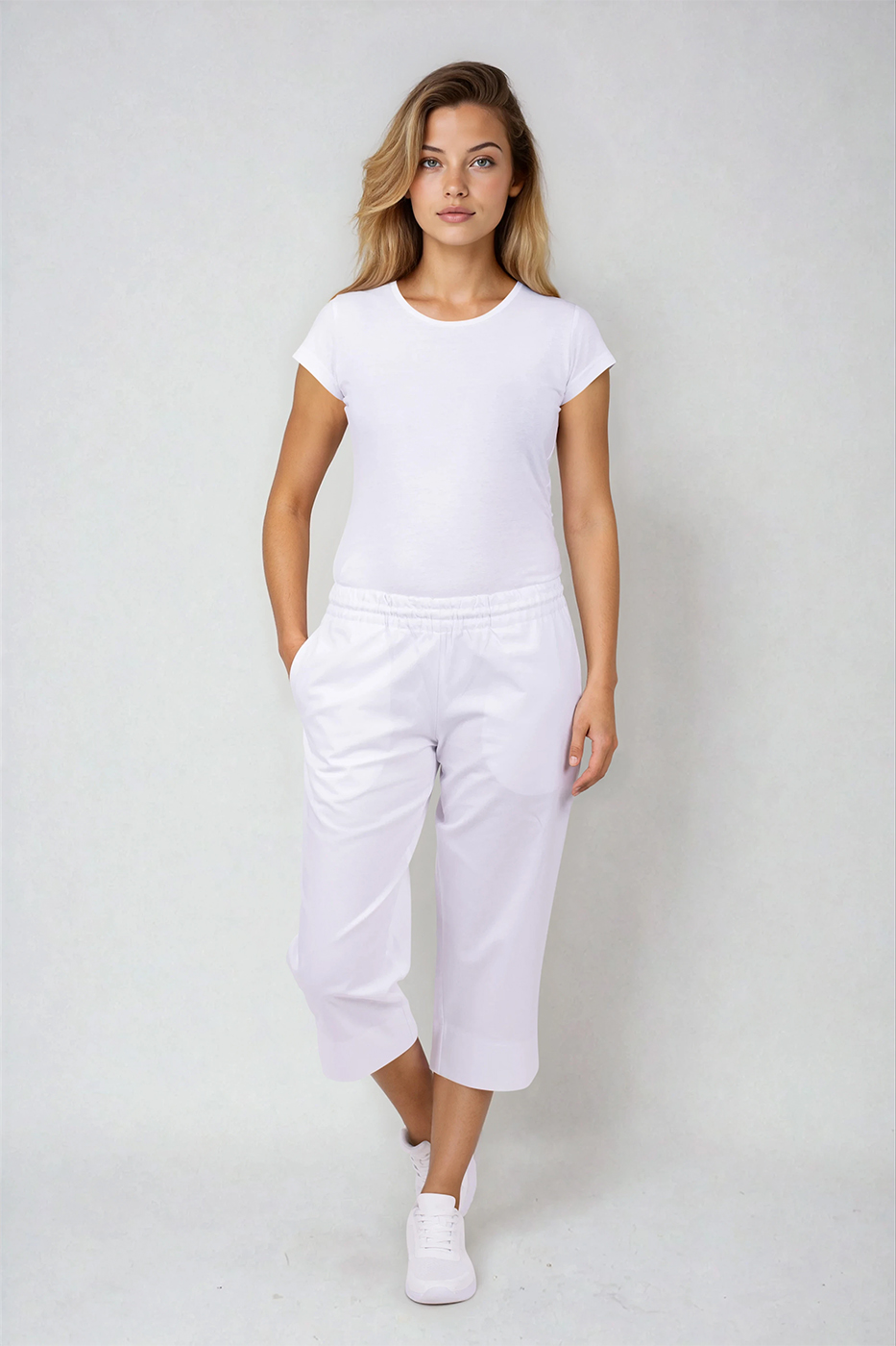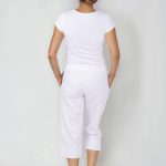 Tříčtvrteční kalhoty dámské bílé Haiti Capri se sníženým pasem, ve kterém jsou 2 vyměnitelné gumy a 1 šňůrka, na nohavicích krátký boční rozparek, 2 švové kapsy.