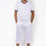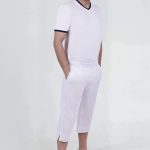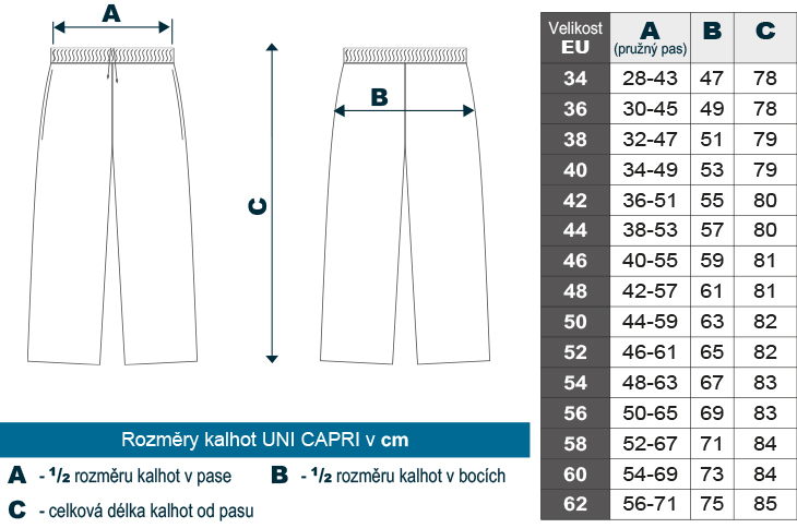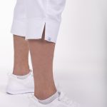 3/4 pracovní kalhoty bílé Uni Capri mají v pase 2 vyměnitelné gumy a 1 stahovací šňůrku, 2 švové kapsy a na koncích nohavic krátké rozparky.