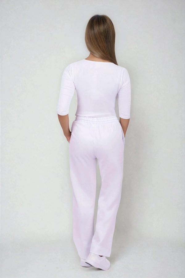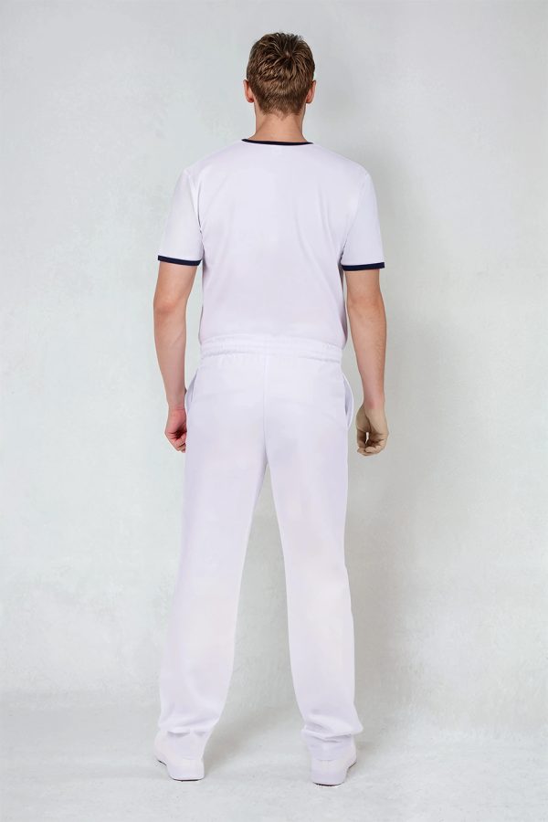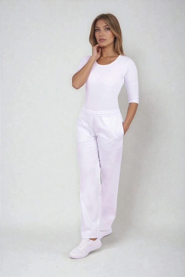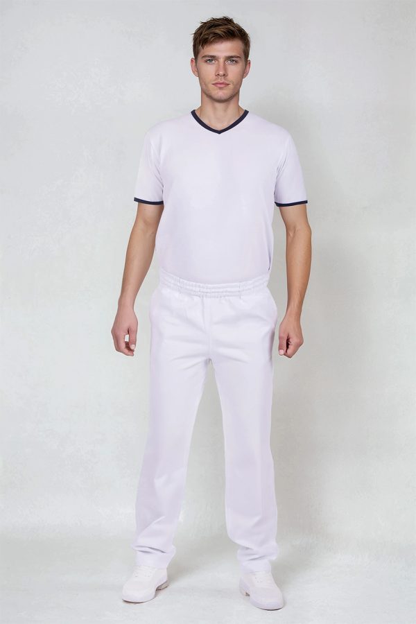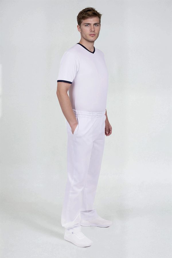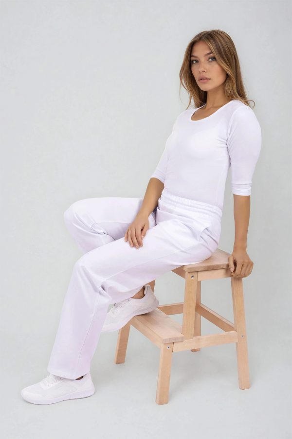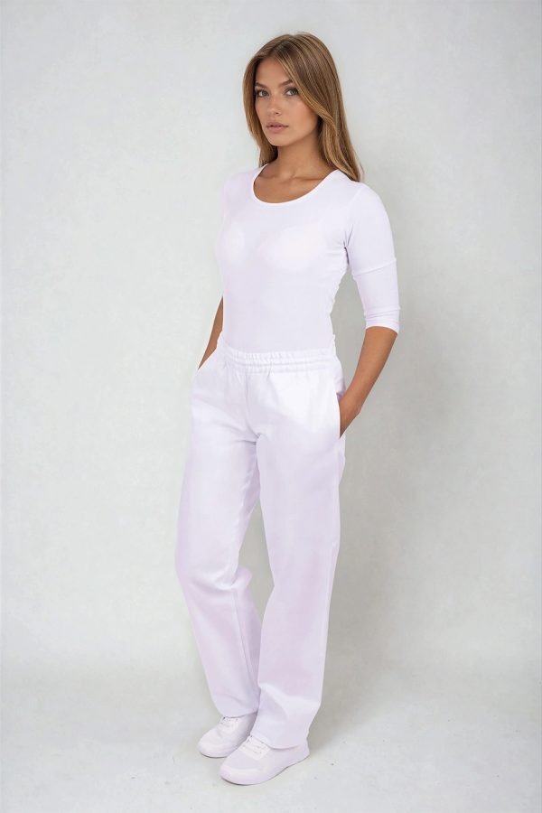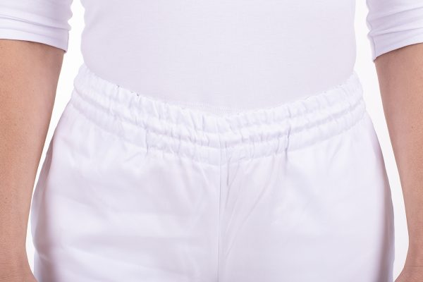 Bílé zdravotnické kalhoty na gumu Uni v pase s dvojitou vyměnitelnou gumou a stahovací šňůrkou pro pohodlné nastavení pasu. Materiál: 100% bavlna, 200g/m2 sanfor., merc., příjemná, vysrážená s keprovou vazbou.- 100% bavlna, prodyšný a savý materiál