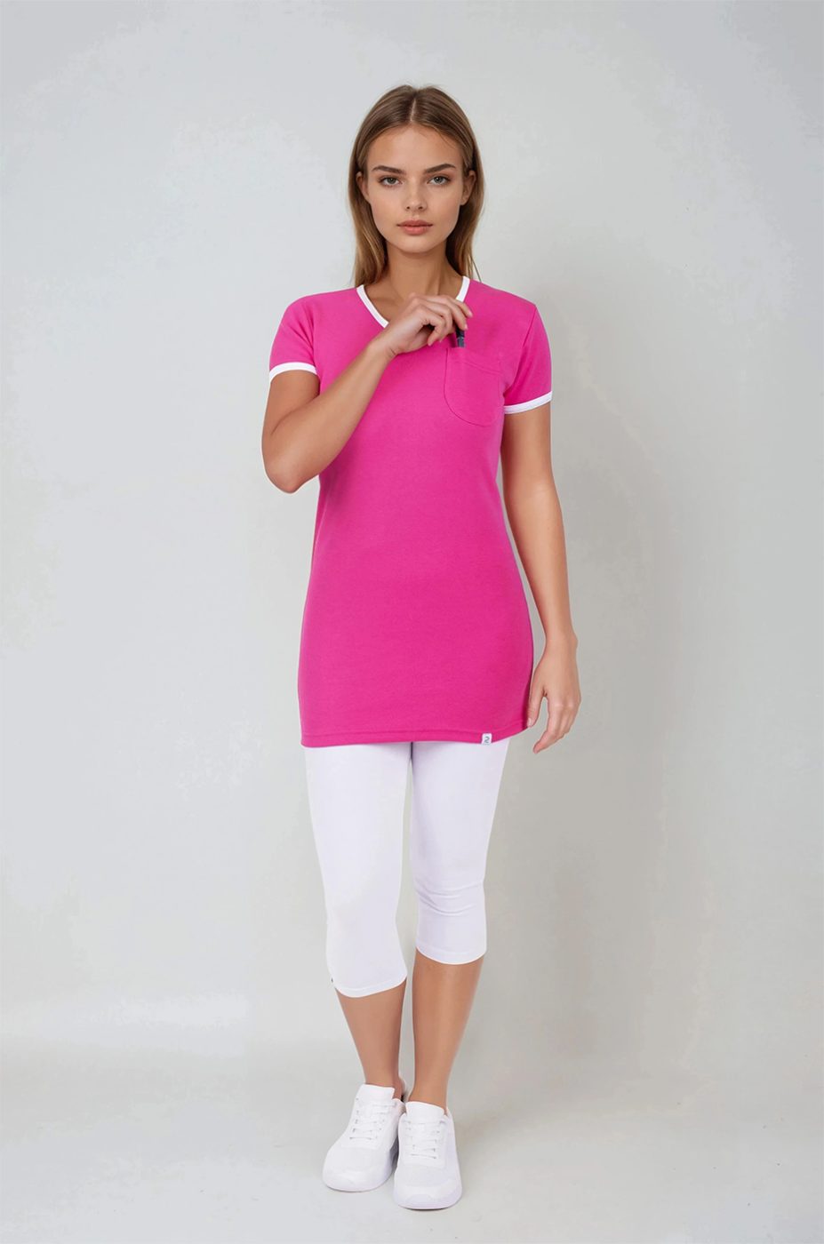 Dámské tričko Vito Duo-A má lehce tvarovaný a slušivý střih s barevnými doplňky na koncích krátkých rukávů a ve výstřihu do V. Na prsou trika je decentní kapsička pro malé drobnosti. Trička šijeme z velmi příjemného, zdravotně nezávadného materiálu a jedná se tak o kvalitní český výrobek.