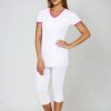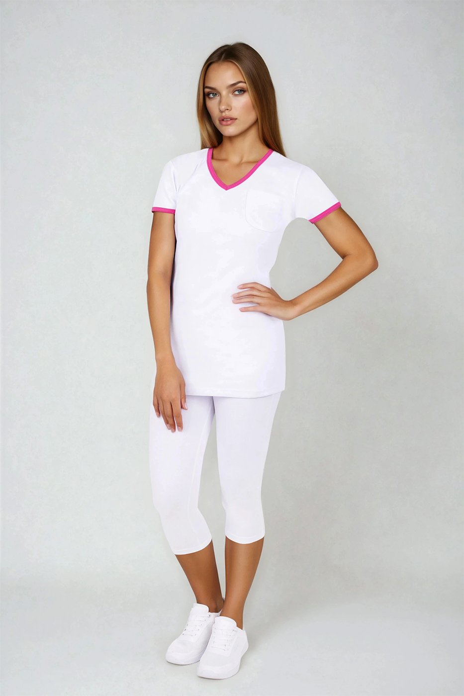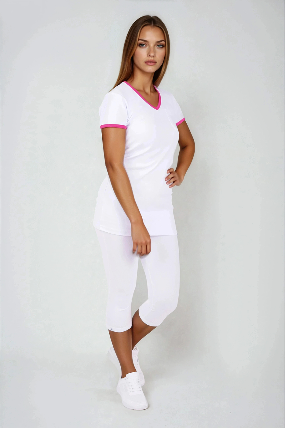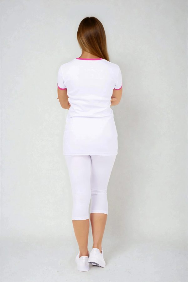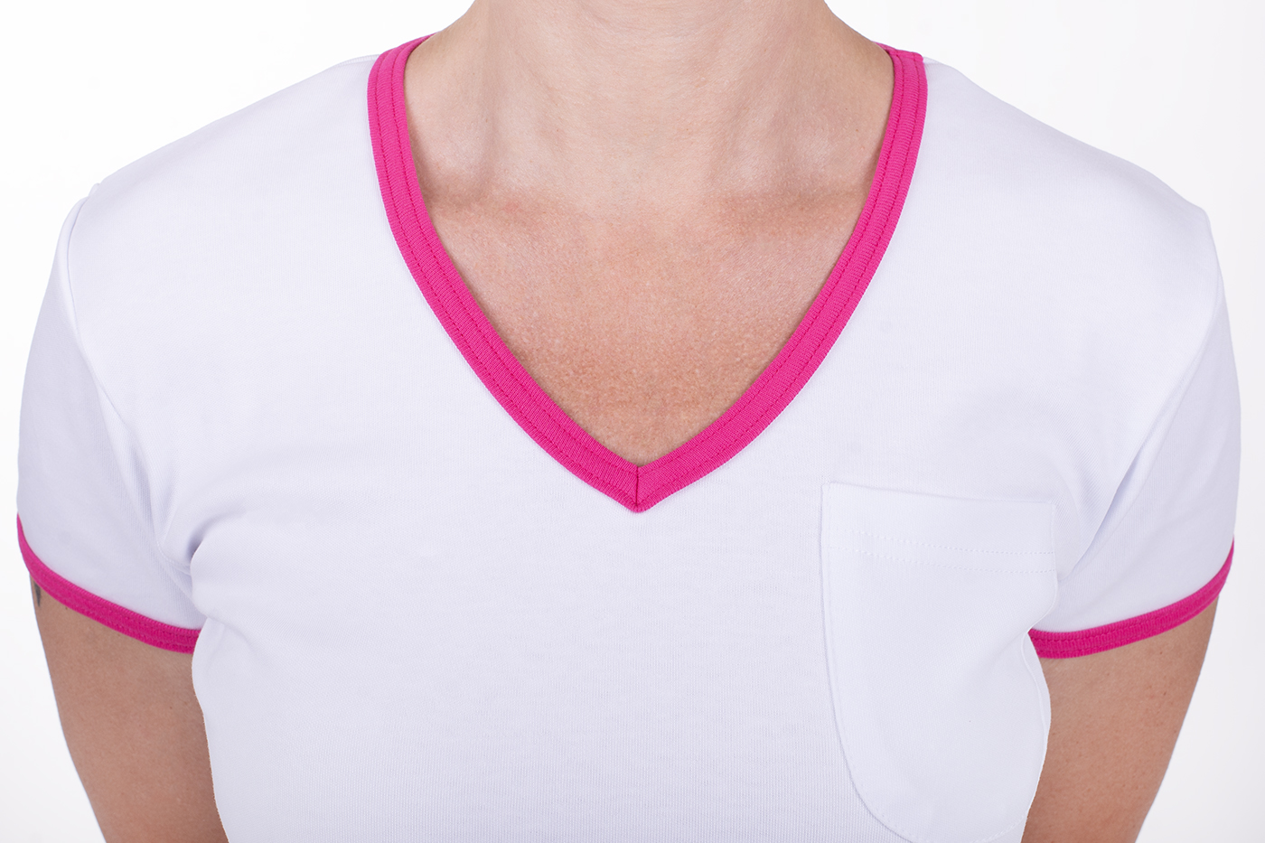 Něžná a přece silná, triko Vita Duo v kombinaci dominantní bílé barvy a doplňků v růžové vyzařuje ženskost a přitom líbivou jednoduchost. Dámské tričko je lehce vypasovaného střihu s krátkým rukávem, což je ideální pro teplé letní dny. Výstřih do tvaru V umožňuje snadné vklouznutí do modelu. Zdobným prvkem je malá kapsička na předním díle a barevné lemování kolem výstřihu a rukávů. Použita je 100% bavlna, materiál je na omak velmi příjemný, zdravotně nezávadný a vy se budete v tričku cítit jako v bavlnce. Jelikož tato trička šijeme v našich dílnách, jedná se tedy o kvalitní český výrobek.