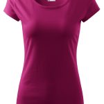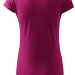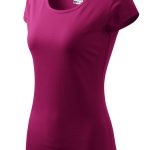 Moderní dámské tričko fuchsia red barvy s velmi krátkým rukávem, kulatým průkrčníkem s olemováním, ramena zpevněná všitým proužkem, projmutým střihem k bokům zvýrazňujícím dámskou siluetu, exkluzivním vzhledem dík finální silikonové úpravě. Materiál: 100% bavlna, 150g/m2. Praní: na 40°C.