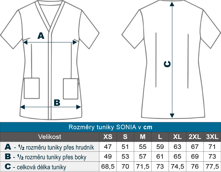 Tunika dámská pracovní Sonia v tm. modré barvě je moderní a funkční oděv nejen pro profesionály. Halena má krátké rukávy, výstřih do V, skryté zapínání na druky a 2 přední kapsy. Haleny jsou dobře prodyšné, odolné vůči postříkání bělidly, jsou rychleschnoucí bez nutnosti žehlení a odpuzují vlasy i srst domácích mazlíčků. Materiál: 100% PES mikrovlákno 148g/m2 s antibakteriální úpravou. Praní: na 90°C.- antibakteriální úprava vláken