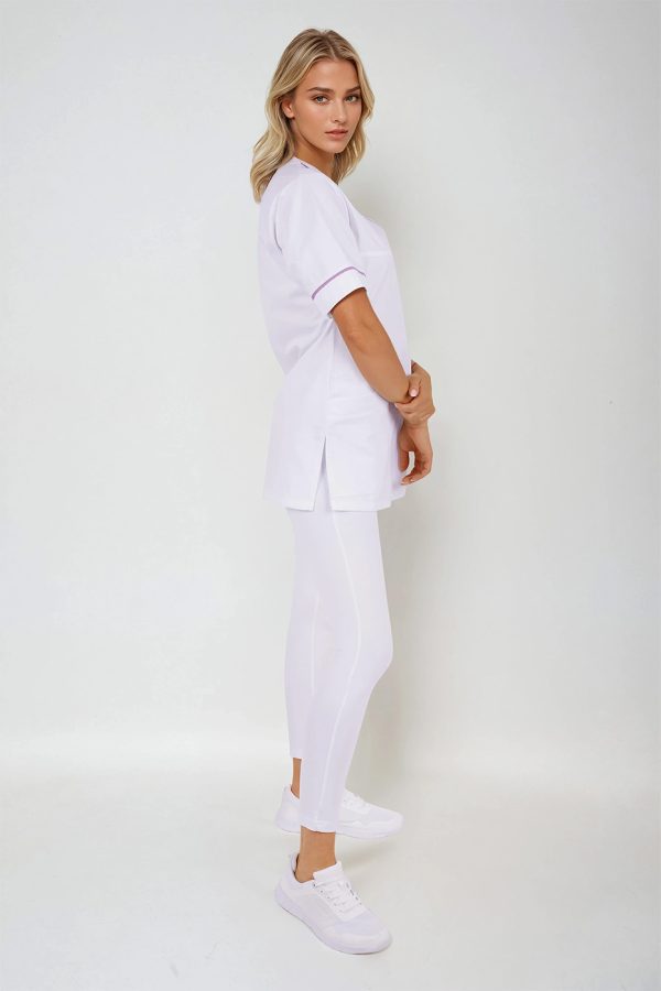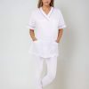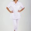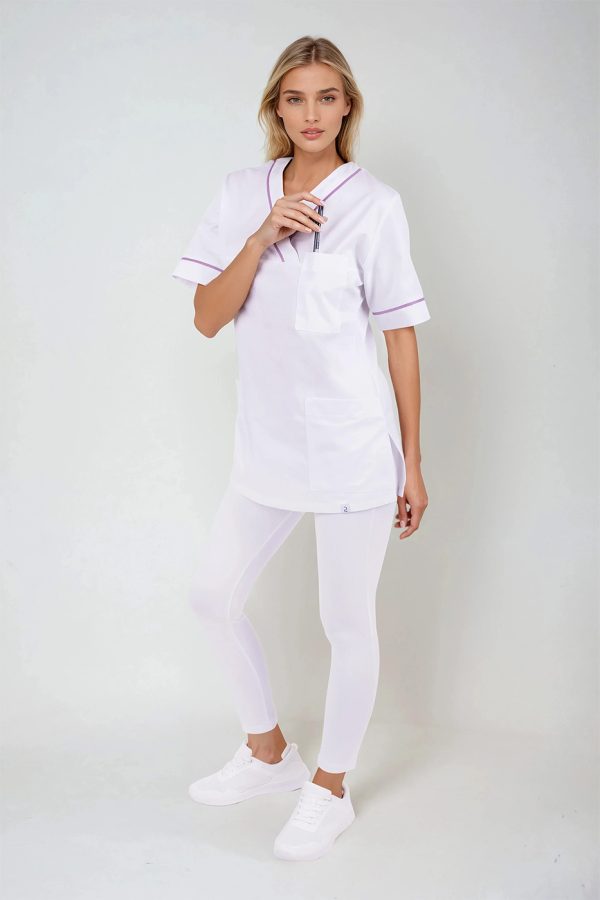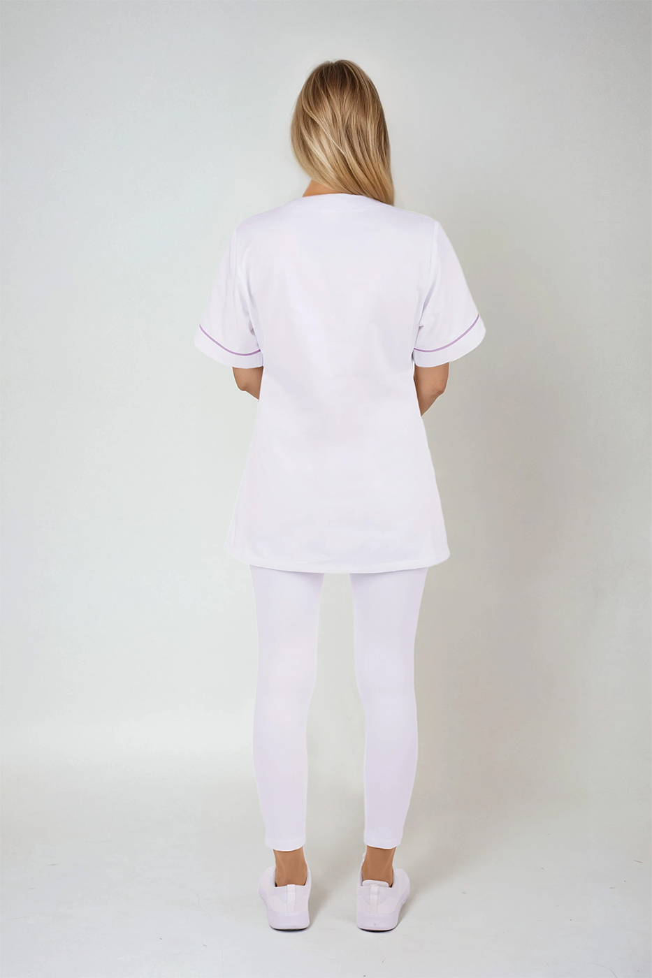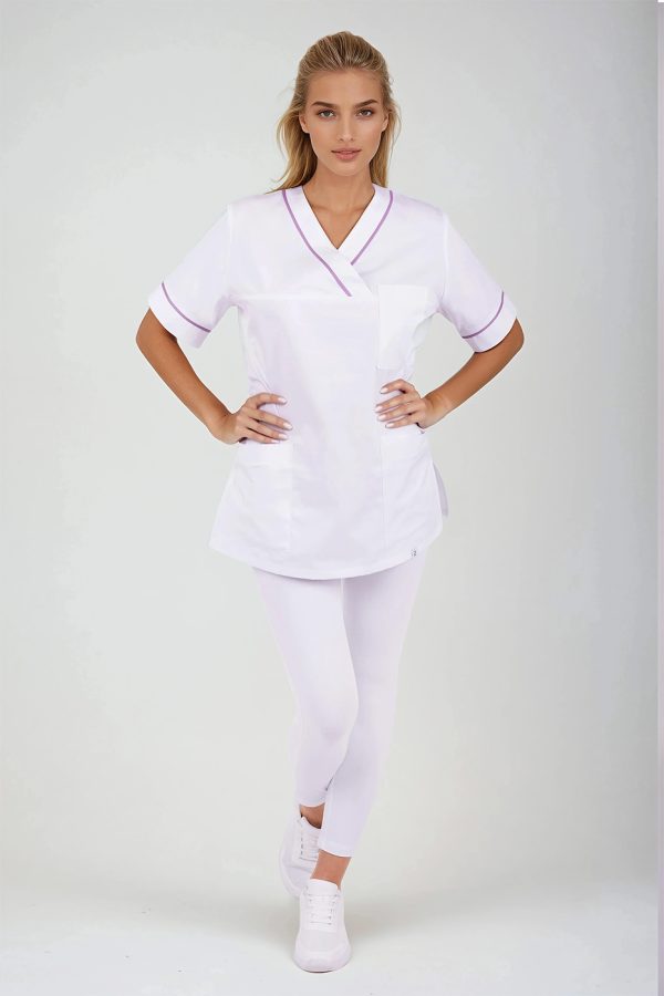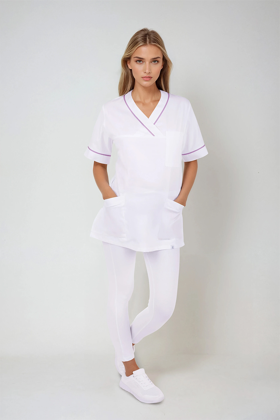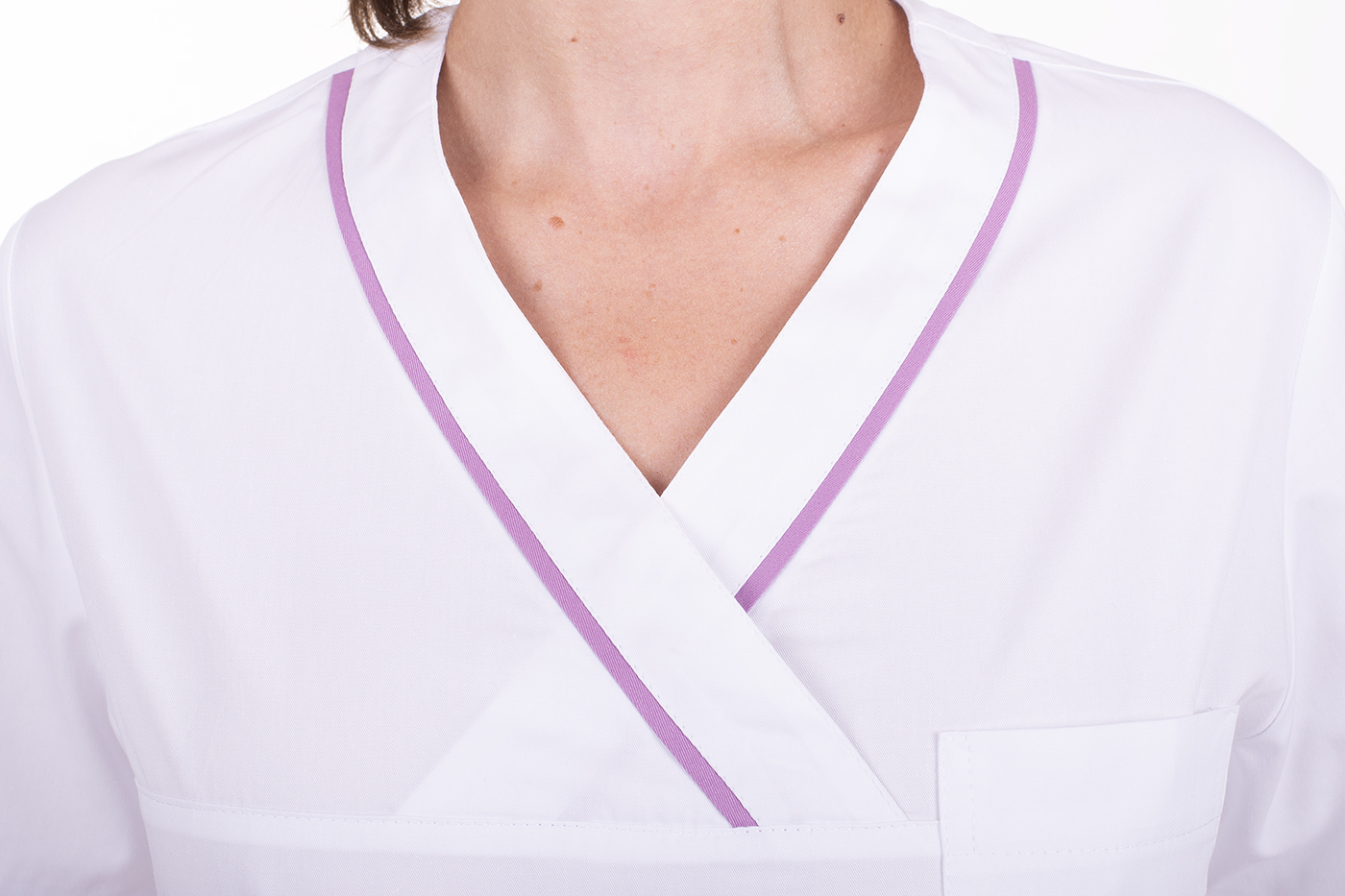 I pracovní oděv může být vkusný a elegantní. Dámská zdravotnická halena Julia-B to dokazuje jednoduchým, ale sofistikovaným designem. Bílá barva navozuje dojem čistoty a profesionality, zatímco decentní barevné lemování výstřihu a rukávů dodává modelu jemný, ale příjemně ženský detail. Výsledkem je esteticky příjemný oděv, který se hodí do jakéhokoliv zdravotnického zařízení – od nemocnic, přes soukromé kliniky až po pečovatelské domy.