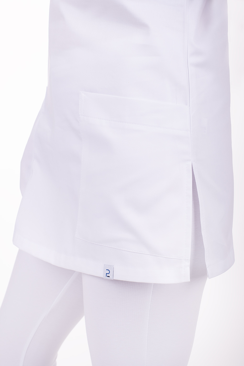 Mírně vypasovaný střih lichotí ženské postavě, aniž by omezoval v pohybu. Rovný dolní lem s bočními rozparky poskytuje dostatek volnosti při každodenních aktivitách – ať už zvedáte pacienty, manipulujete s přístroji nebo běháte mezi odděleními.