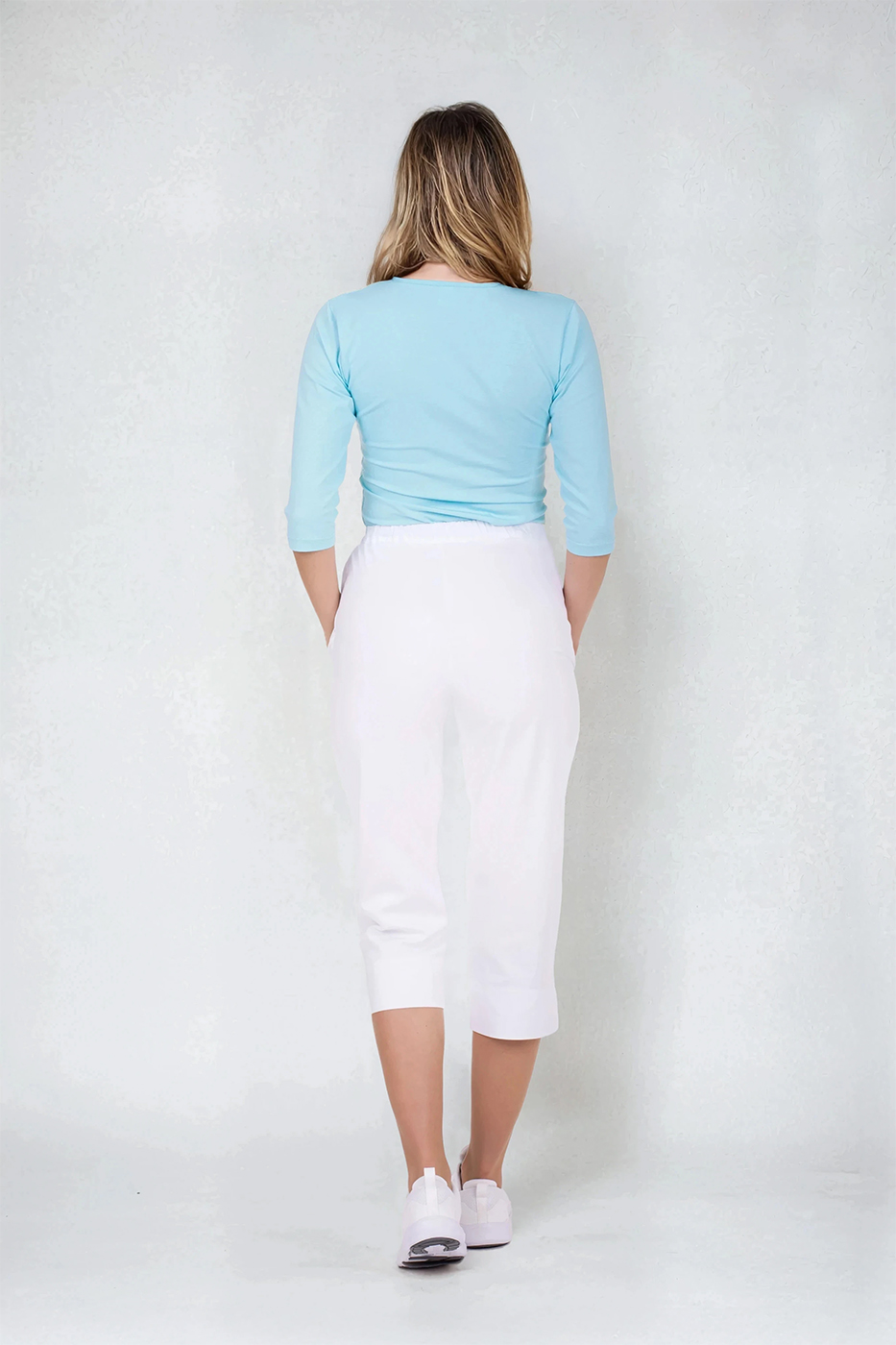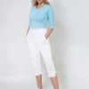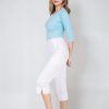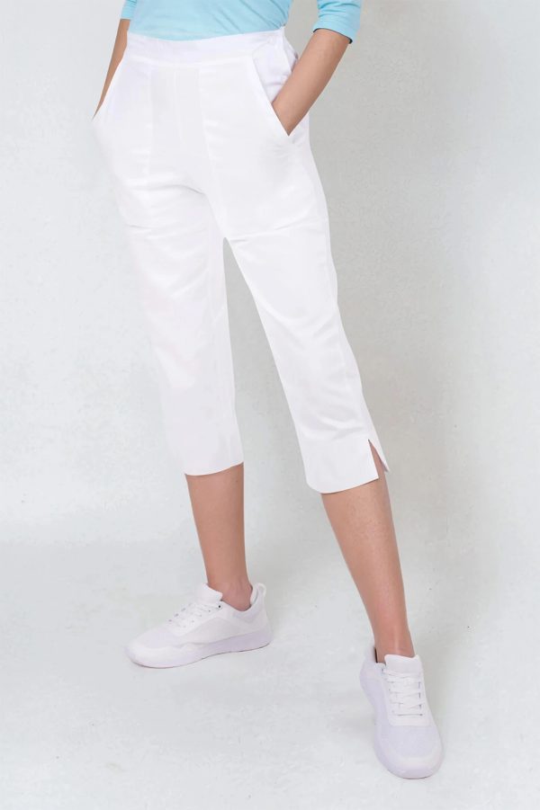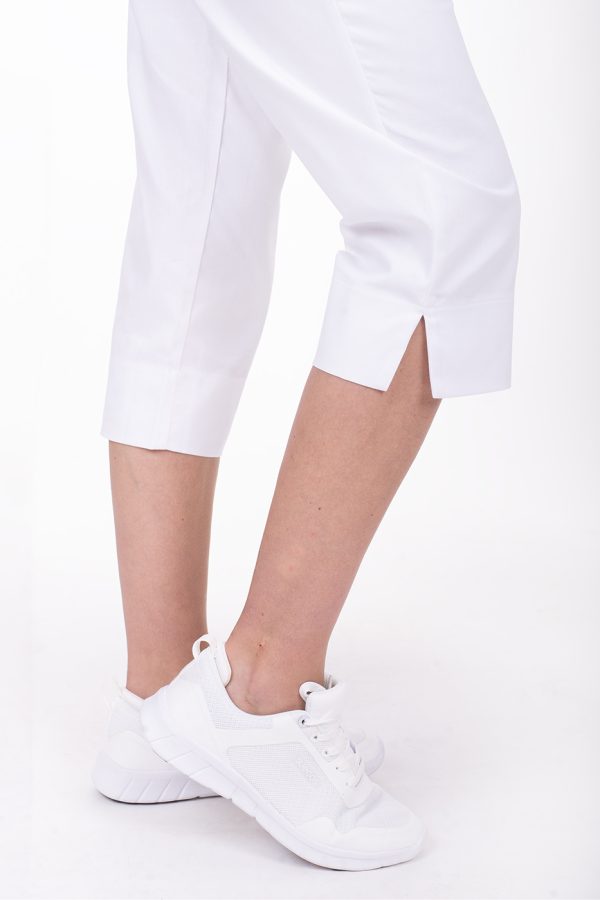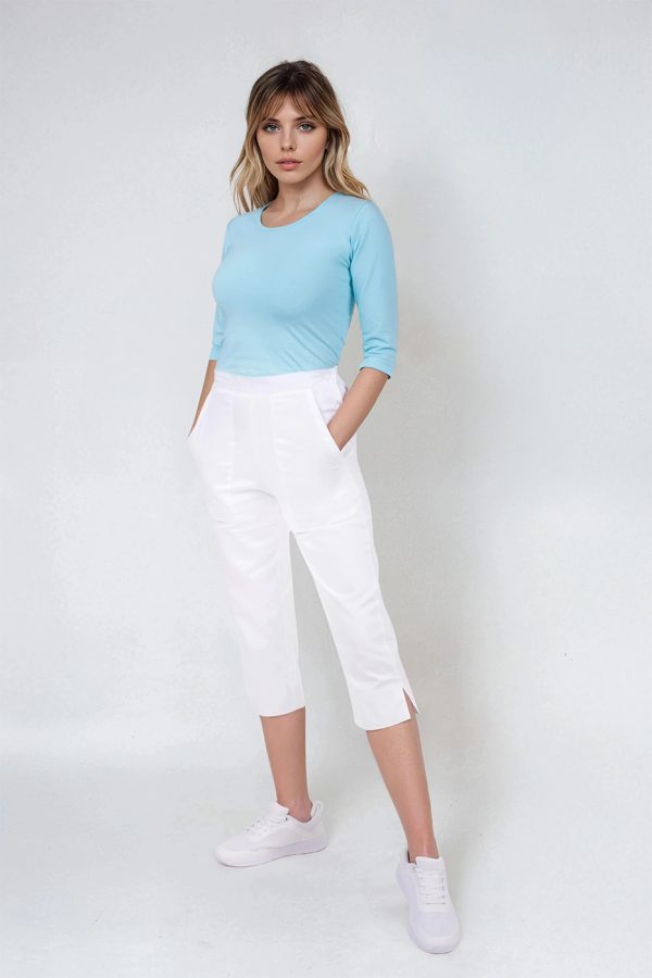 Dámské 3/4 kalhoty bílé Bocci Capri do pasu s bočním zapínáním a gumou v části pasu, boční rozparky na koncích nohavic, 2 přední prostorné kapsy.- 100% bavlna, dobře prodyšný a savý materiál