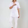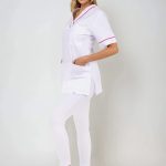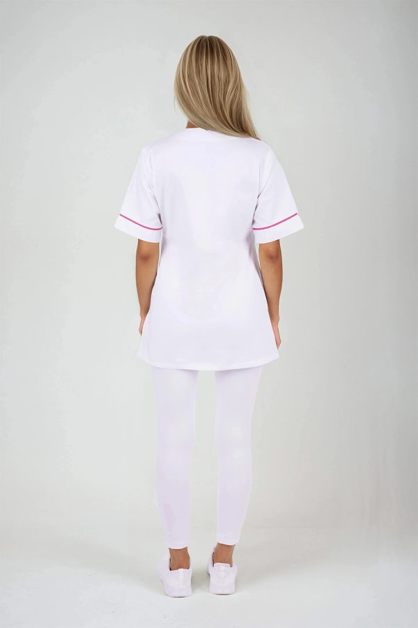 Díky univerzální barvě bílé s jahodovým akcentem lze halenu snadno sladit s ostatními prvky pracovního oděvu.