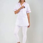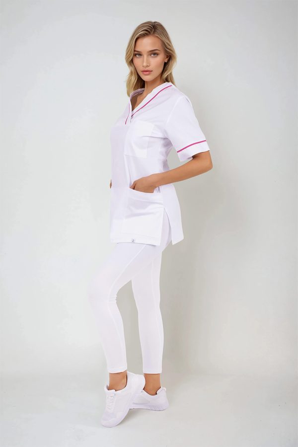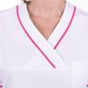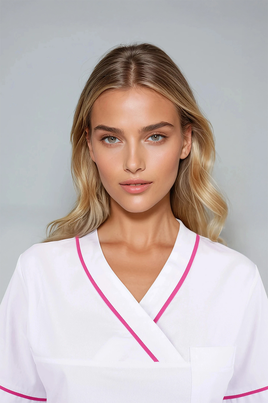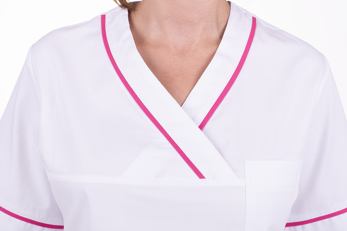 Kontrastní barevné prvky v odstínu jahoda nejen oživují vzhled haleny, ale také ji odlišují od klasického unisex pracovního oblečení. Detaily v barvě jahody se objevují na lemování výstřihu, rukávů a kapsách, čímž vzniká atraktivní, ale stále decentní kombinace. Tato barevná hra přináší do pracovního dne optimismus a ženský styl, ať už v nemocničním provozu, nebo na recepci.