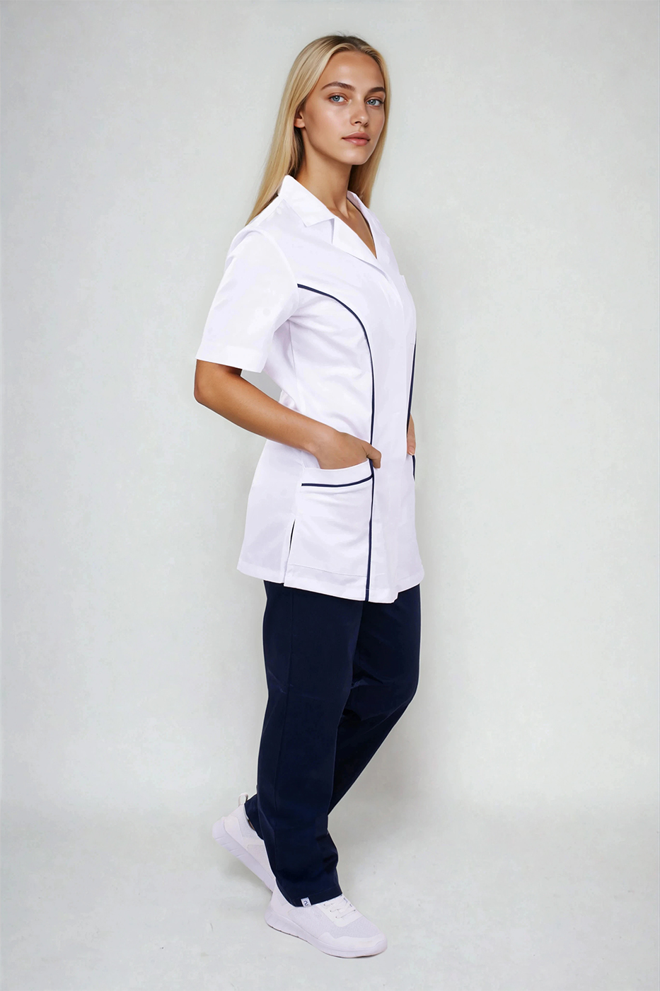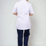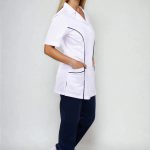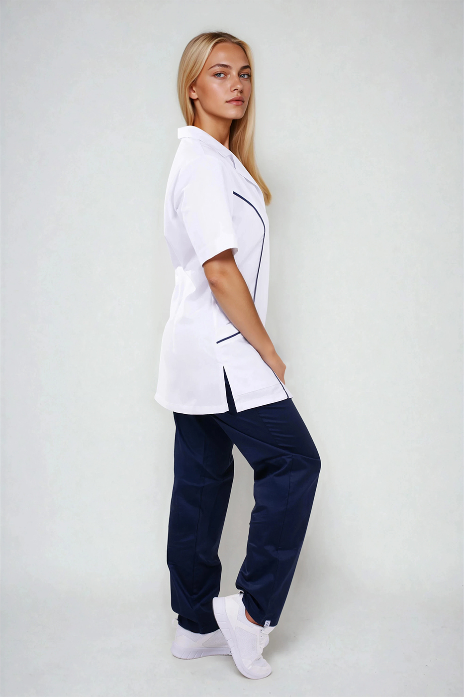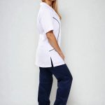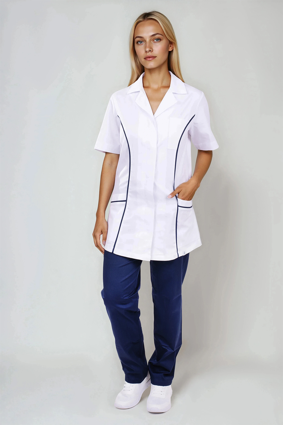Velmi důležitým prvkem je střih, který respektuje ženskou siluetu, ale zároveň není těsný ani omezující v pohybu. Prodloužená délka chrání záda i při ohýbání nebo sedu a zabraňuje nechtěnému vyhrnování. Kombinace bílého základu a tmavě modrých detailů navíc působí profesionálně, ale ne fádně – přesně tak, jak by mělo pracovní oblečení vypadat.