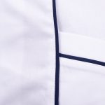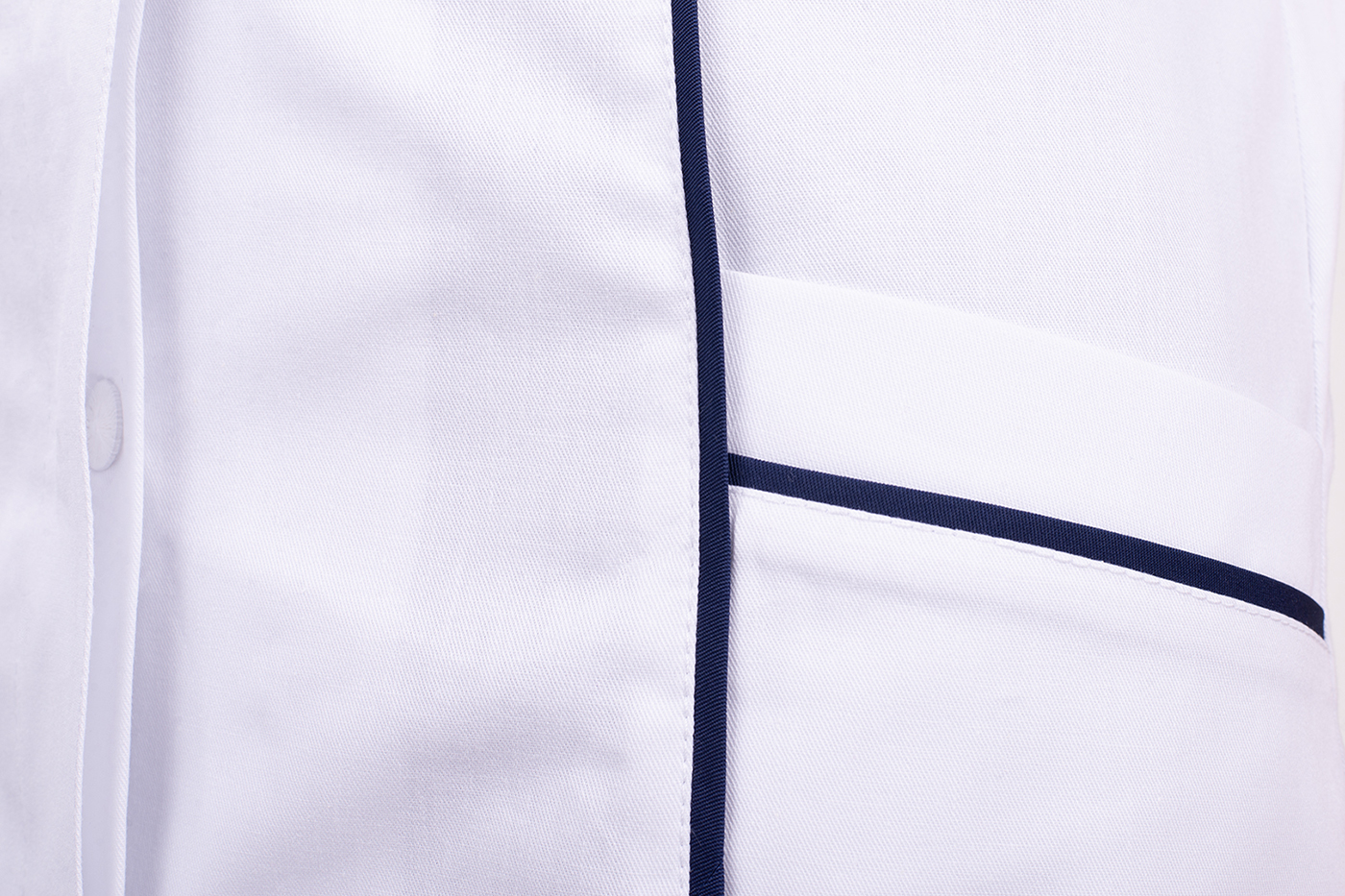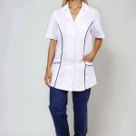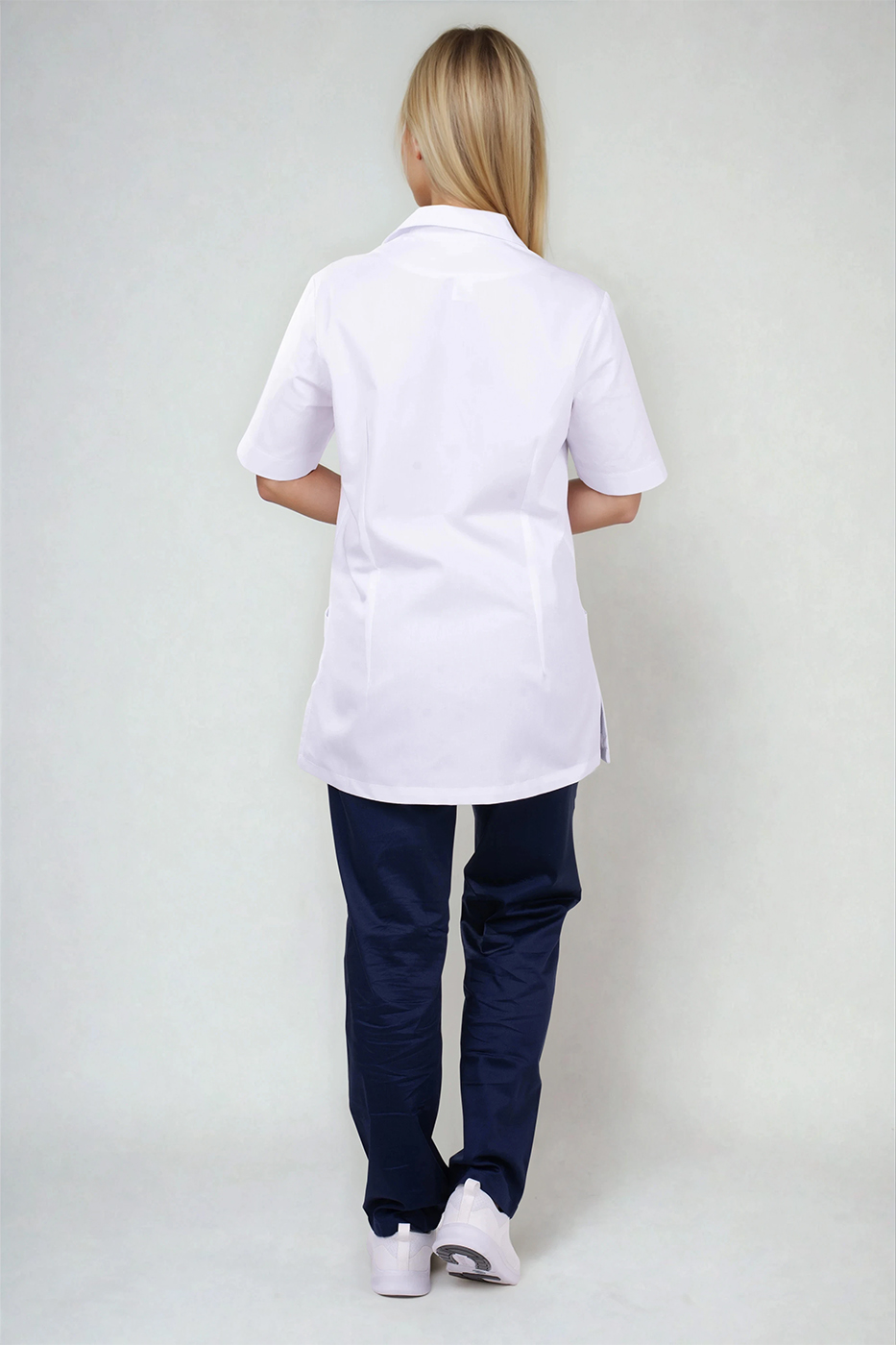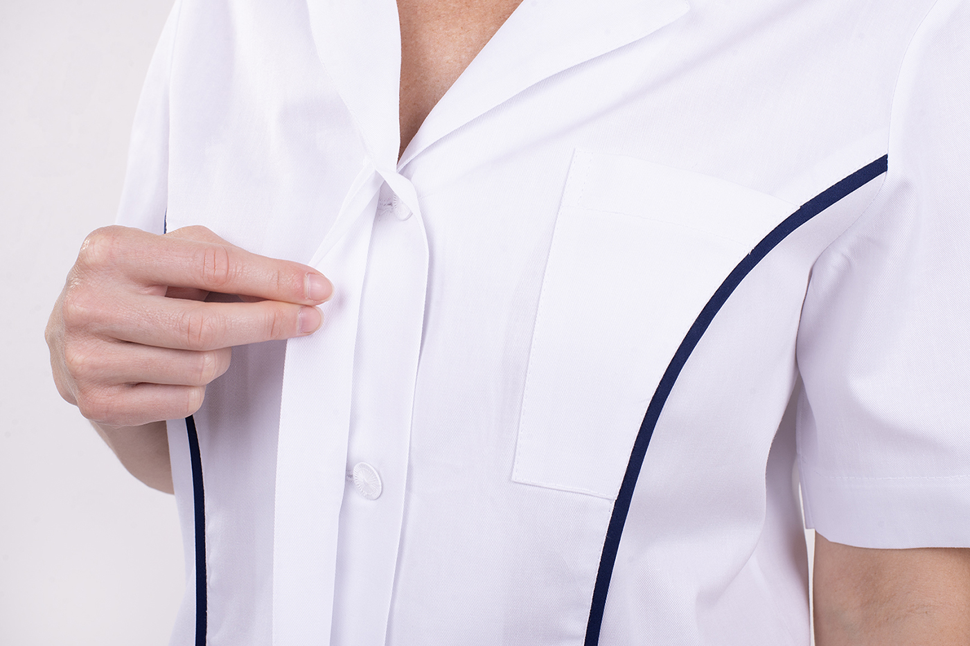 Velmi důležitým prvkem je střih, který respektuje ženskou siluetu, ale zároveň není těsný ani omezující v pohybu. Prodloužená délka chrání záda i při ohýbání nebo sedu a zabraňuje nechtěnému vyhrnování. Kombinace bílého základu a tmavě modrých detailů navíc působí profesionálně, ale ne fádně – přesně tak, jak by mělo pracovní oblečení vypadat.