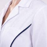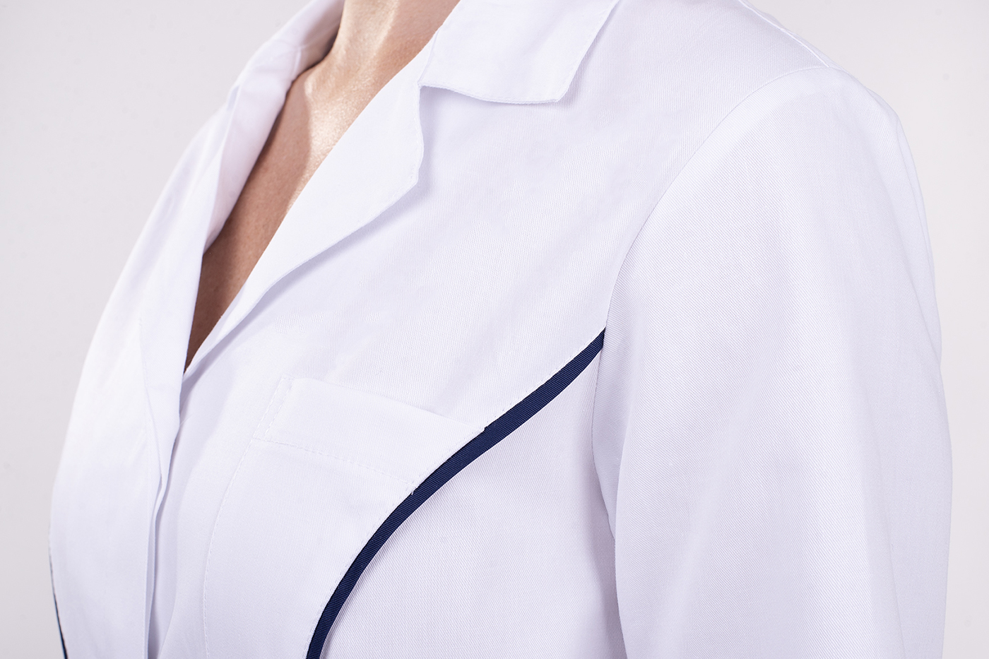 Bílá barva symbolizuje čistotu a profesionalitu, tmavě modré prvky zase dodávají halence moderní a elegantní vzhled. Výsledkem je model, který se hodí téměř do každého prostředí – od nemocnic a klinik až po soukromé kosmetické salony nebo laboratoře.