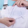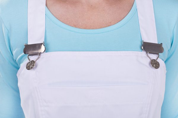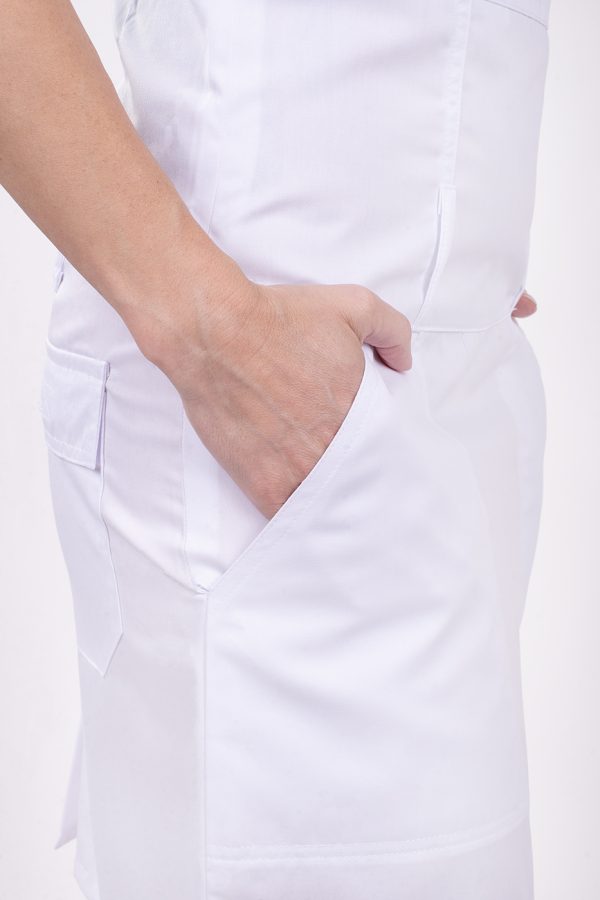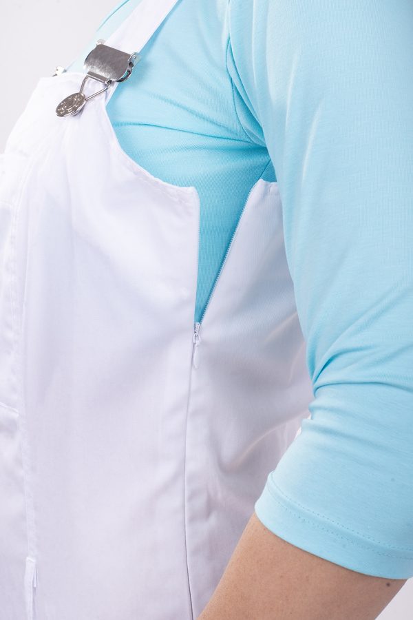 Dámské šaty s laclem Toffi bílé mají sportovní vzhled s ozdobným dvojitým štepováním a 5 kapsami, sukně je mírně rozšířená se zapínáním na zdrhovadlo v bočním švu. Součástí dodávky není pásek.
