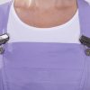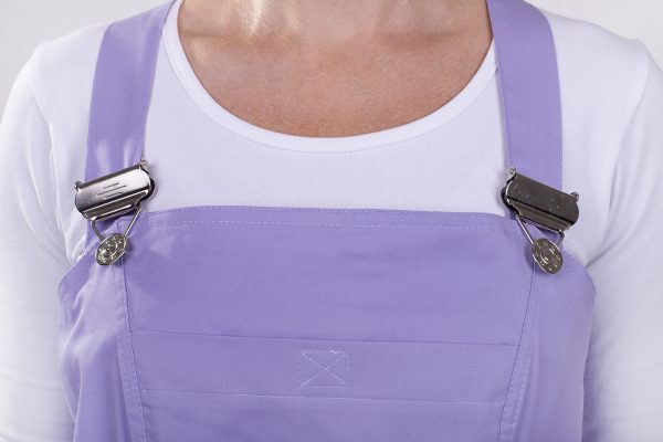 Dámské šaty s laclem Toffi fialové sportovního vzhledu s ozdobným dvojitým štepováním a 5 kapsami, sukně je mírně rozšířená se zapínáním na zdrhovadlo v bočním švu. Součástí dodávky není pásek.