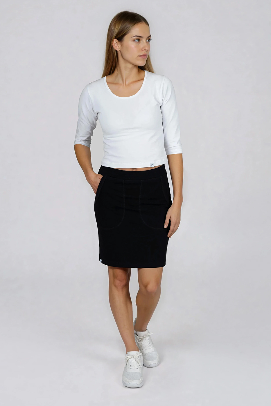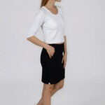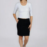 Dámské sukně Brazil s kapsami s rovným tvarujícím střihem, pružným pasem bez zapínání a gumou v pase, 2 nakládané kapsy v přední části. Příjemný a pružný materiál.
