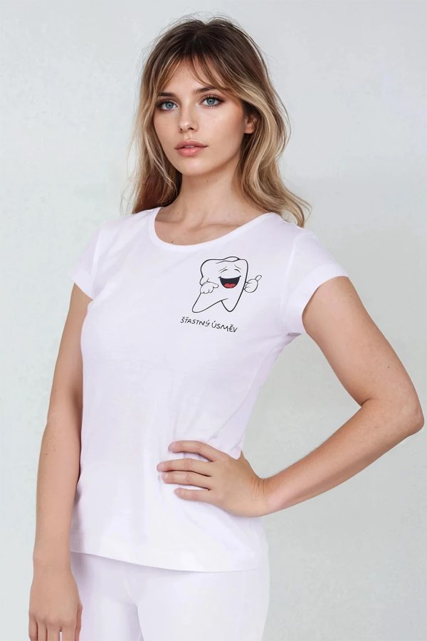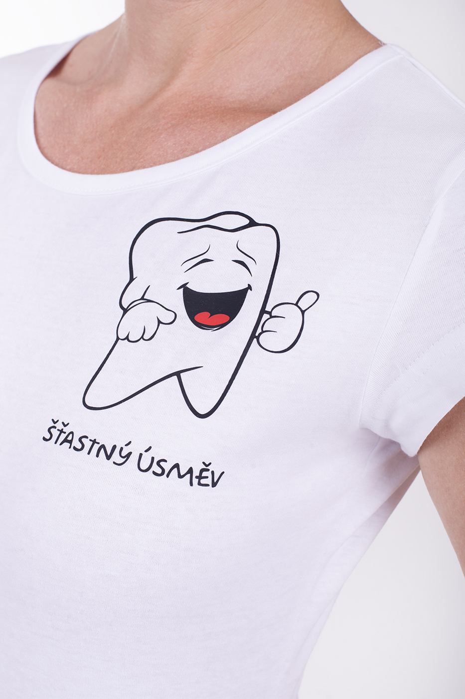 Moderní dámské tričko Šťastný úsměv New s velmi krátkým rukávem, kulatým průkrčníkem s olemováním, ramena zpevněná všitým proužkem, projmutým střihem v bocích.- jemný, prodyšný na omak příjemný materiál
