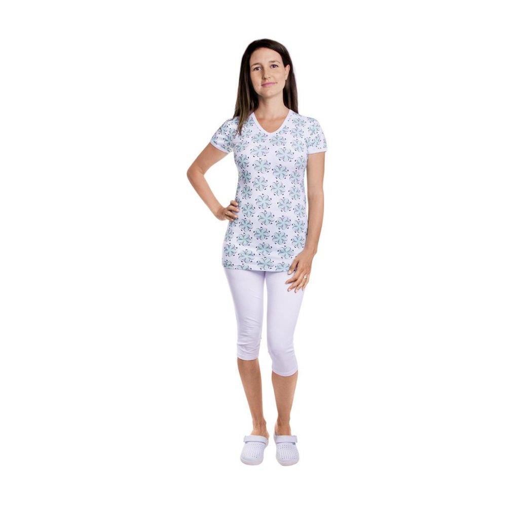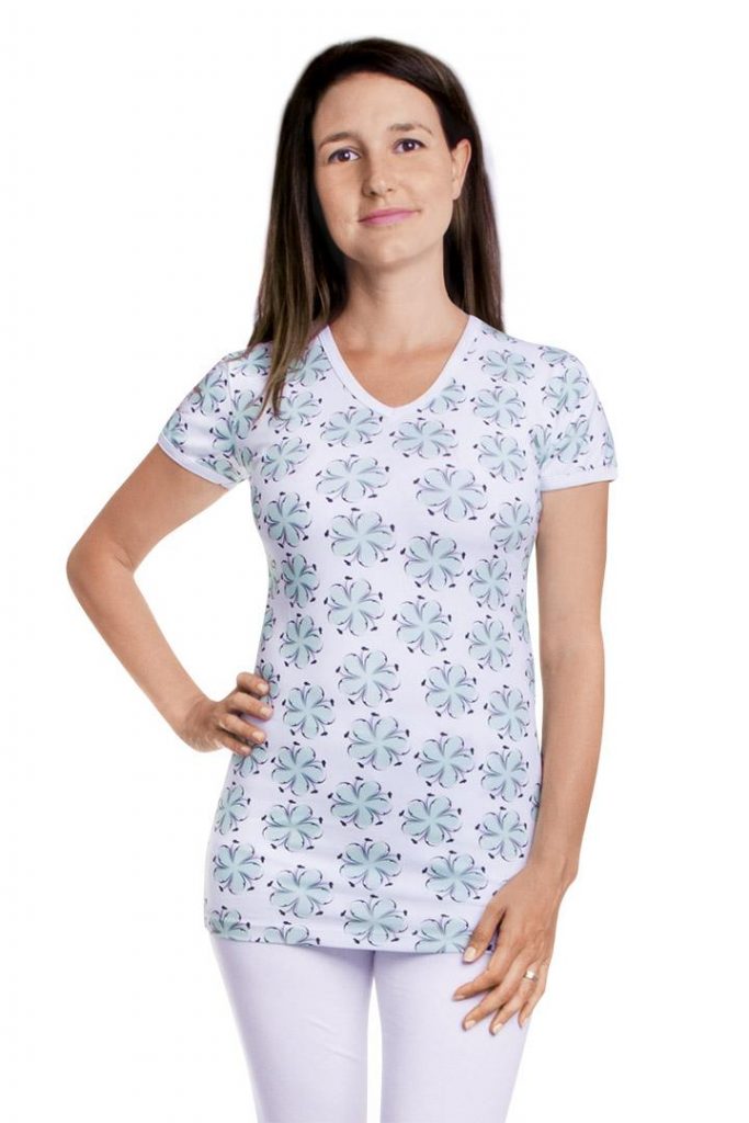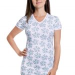 Dámské triko Vito Flora s mentolovým potiskem, výstřihem do V a krátkými rukávy, má lehce projmutý střih, dík kterému je nošení velmi pohodlné a bude vás bavit.