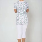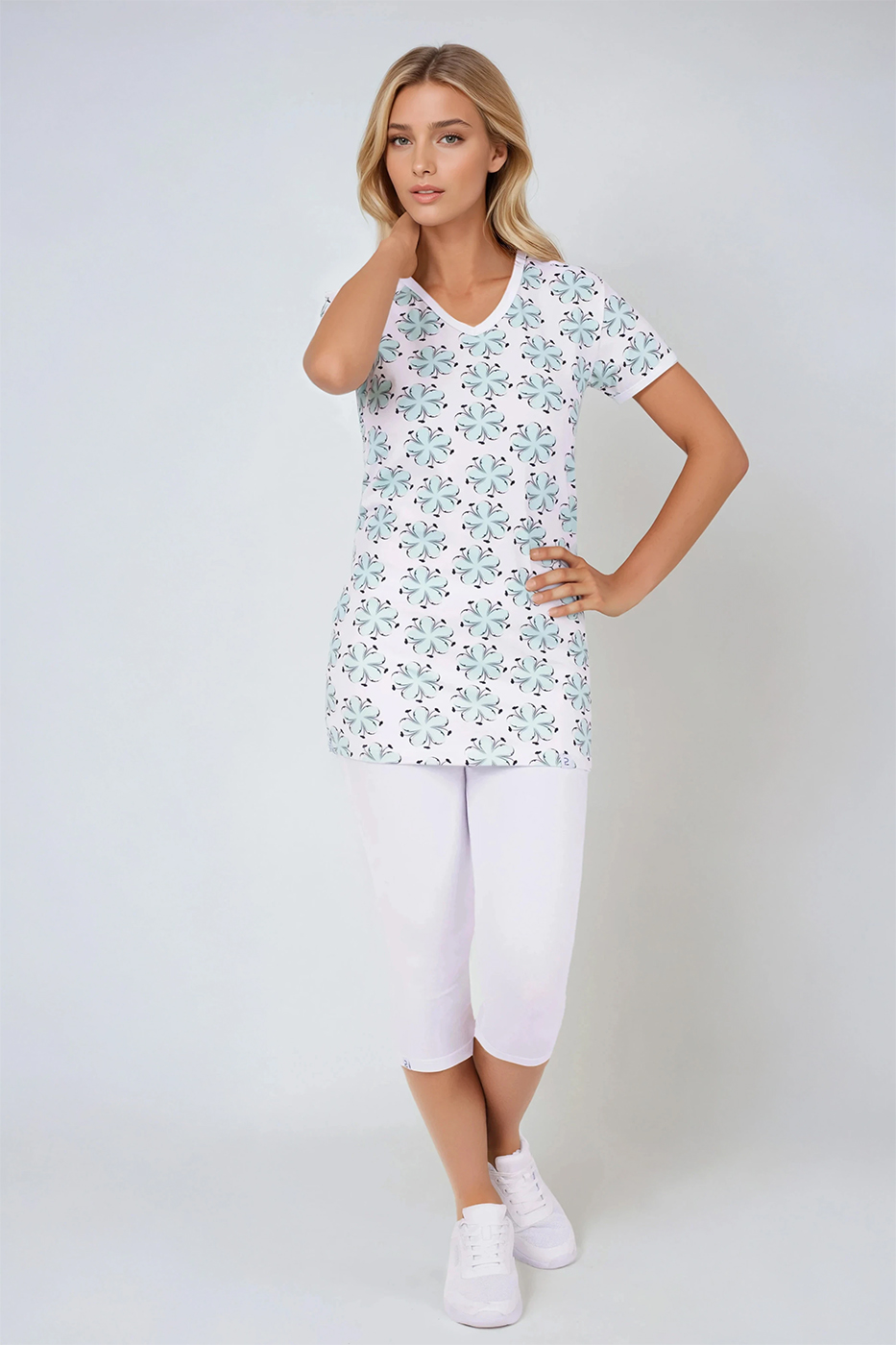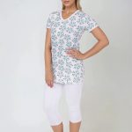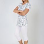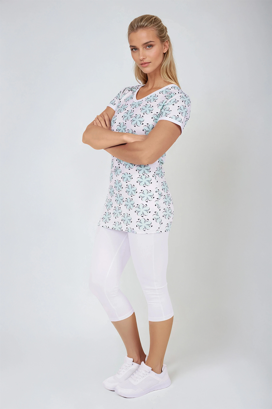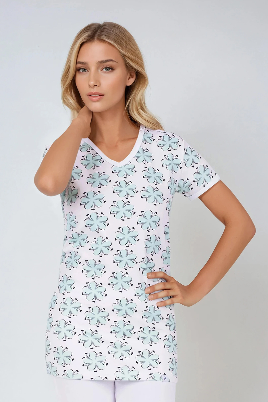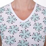 Dámské triko Vito Flora s mentolovým potiskem, výstřihem do V a krátkými rukávy, má lehce projmutý střih, dík kterému je nošení velmi pohodlné a bude vás bavit.