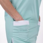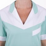 Střih dámské zdravotnické haleny Paris je rovný a pohodlný, což zaručuje svobodu pohybu i při velmi aktivní pracovní náplni. Průkrčník je začištěn decentním stojáčkem, který působí profesionálně a upraveně. Krátké rukávy umožňují volnost rukou a lepší ventilaci během celého dne.