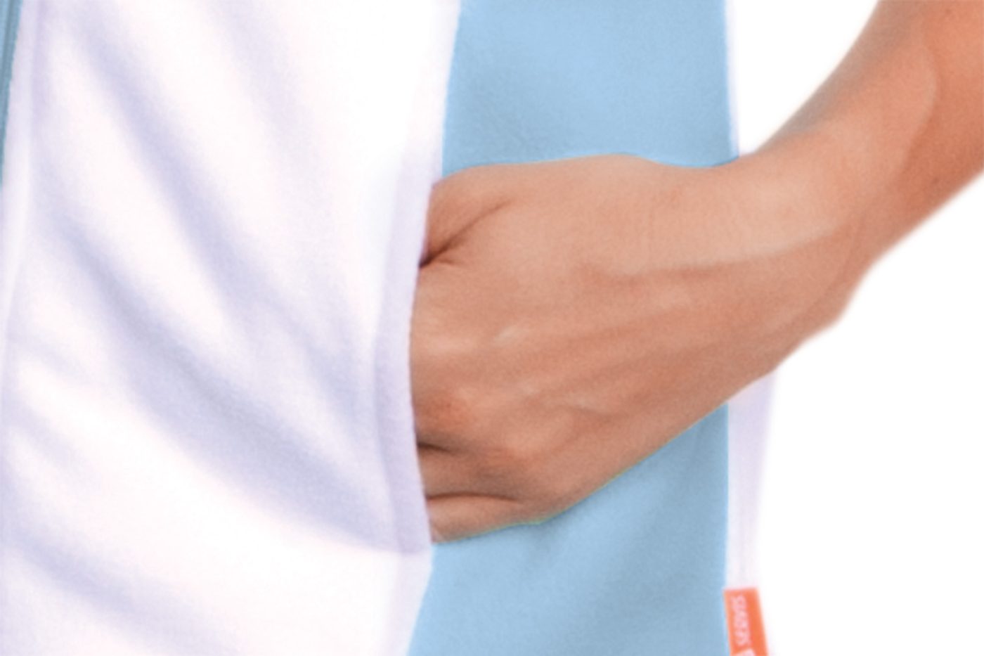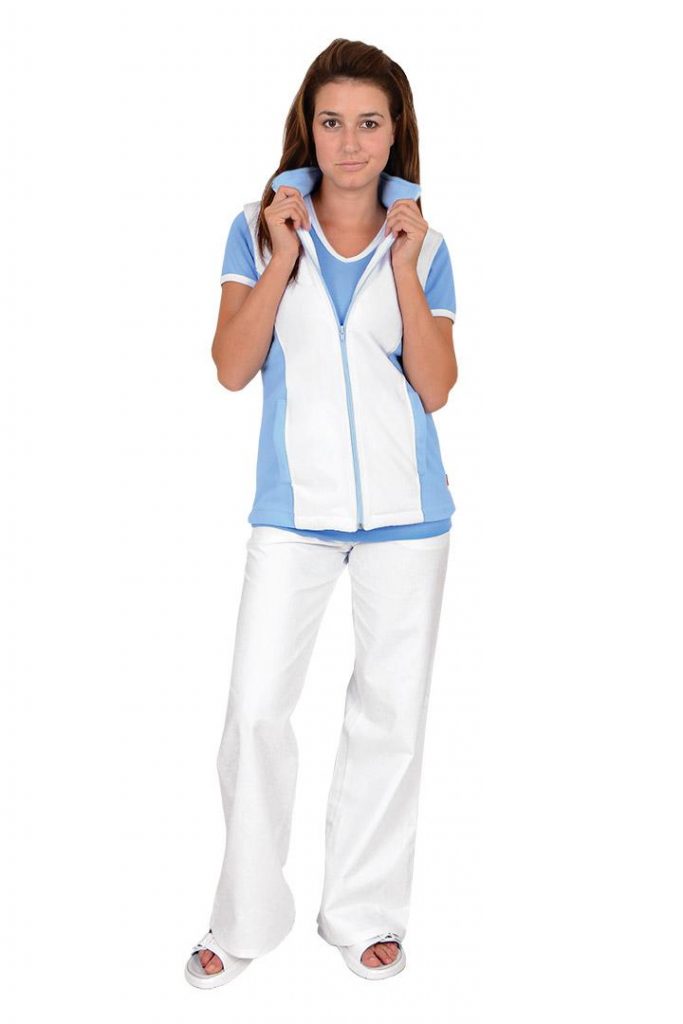Fleecová vesta Fitnes v líbivé barevné kombinaci bílé a světle modré barvě, s celopropínacím zapínáním na zdrhovadlo a dvěma kapsami.
