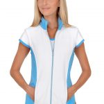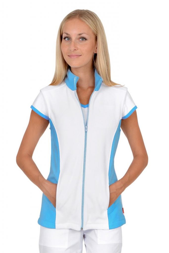 Fleecová vesta Fitnes je slušivá dámská vestička v moderní barevné kombinaci bílé a tyrkysové barvy, celopropínací zapínání na zdrhovadlo, 2 přední kapsy.