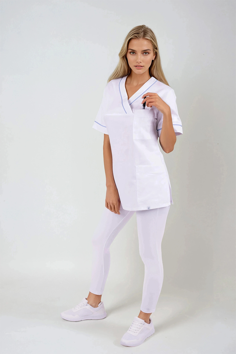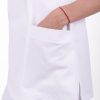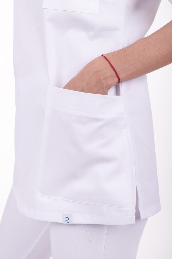 Halena zdravotnická Julia-B byla navržena s ohledem na každodenní potřeby zdravotnického personálu – od lékařek a sester až po laborantky a pečovatelky. Její mírně vypasovaný střih lichotí ženské postavě, ale zároveň neomezuje v pohybu. Díky praktickému oblékání přes hlavu je oblékání i svlékání otázkou okamžiku, což oceníte zejména ve stresových situacích nebo při střídání směn.