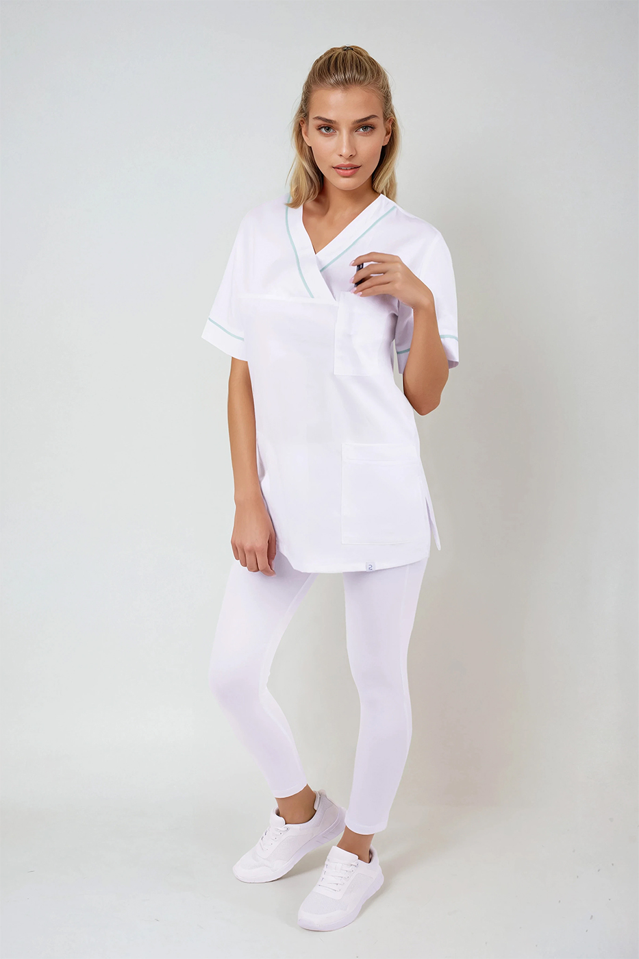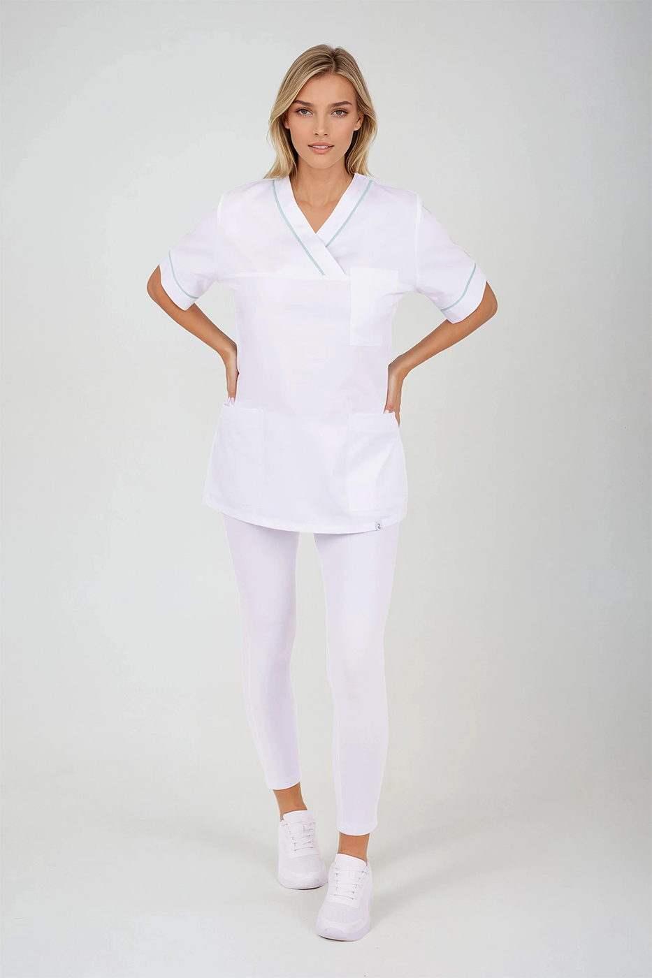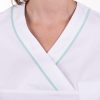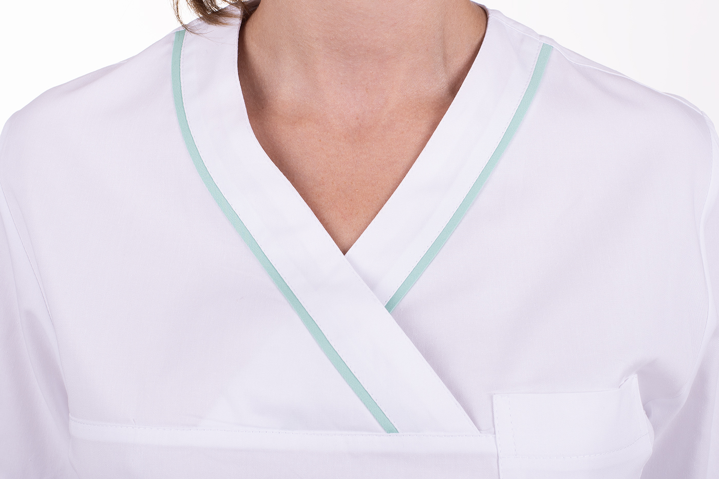 Halena zdravotnická Julia-B bílá/mentol má mírně vypasovaný střih, výstřih do V a praktické oblékání přes hlavu. V přední části je sedlové členění, rukávy a výstřih mají decentní barevné zdobení.