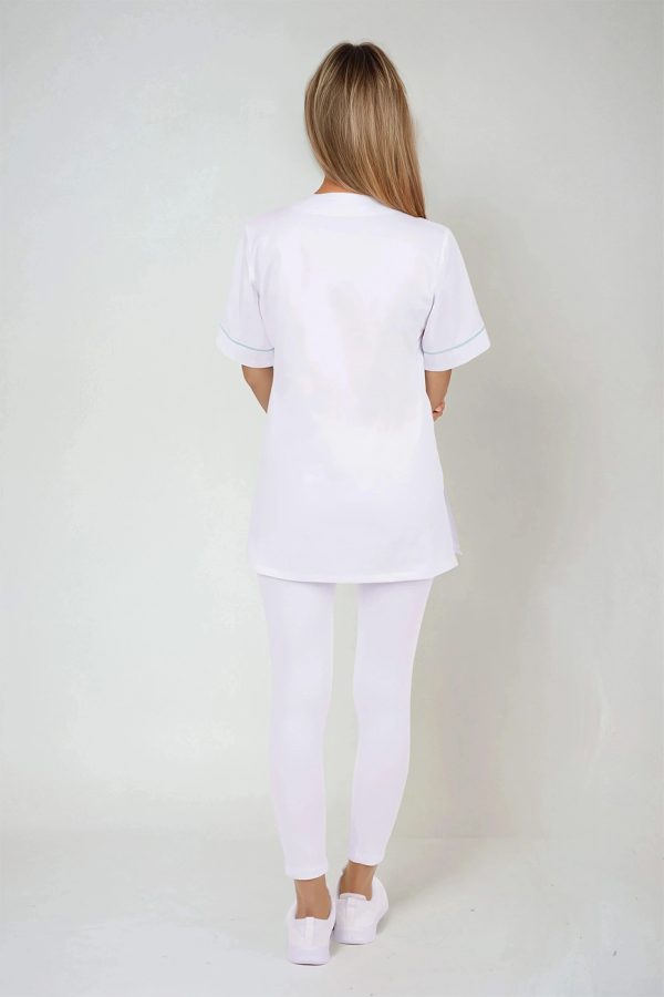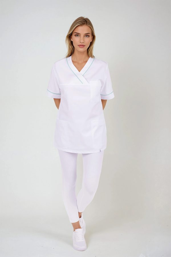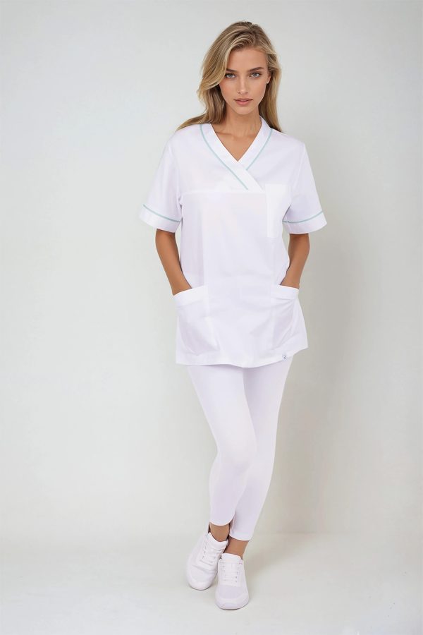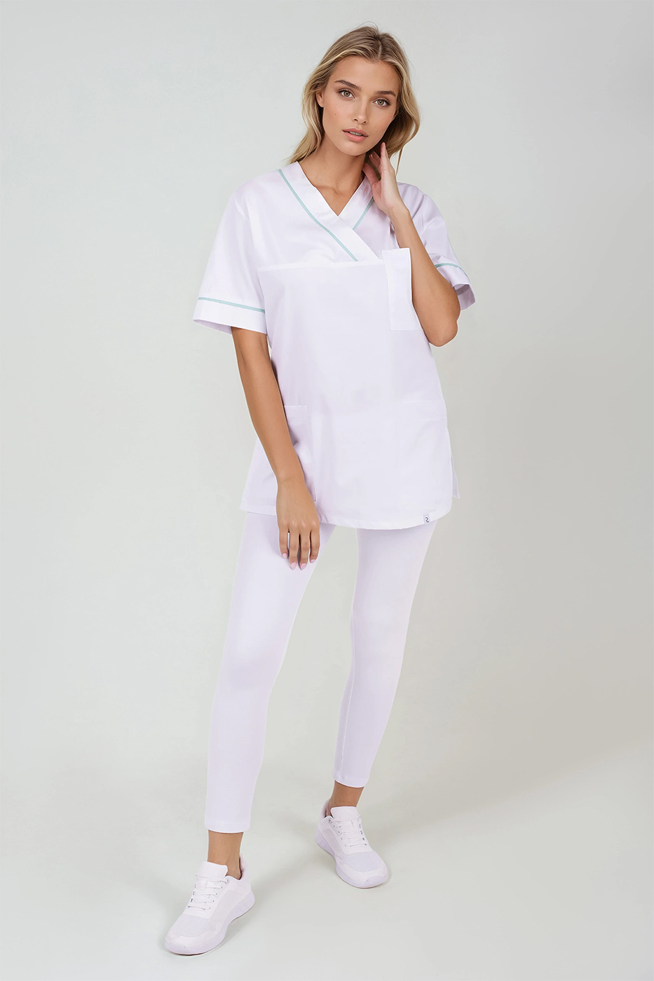 Halena zdravotnická Julia-B bílá/mentol má mírně vypasovaný střih, výstřih do V a praktické oblékání přes hlavu. V přední části je sedlové členění, rukávy a výstřih mají decentní barevné zdobení.