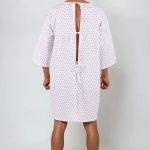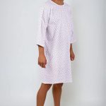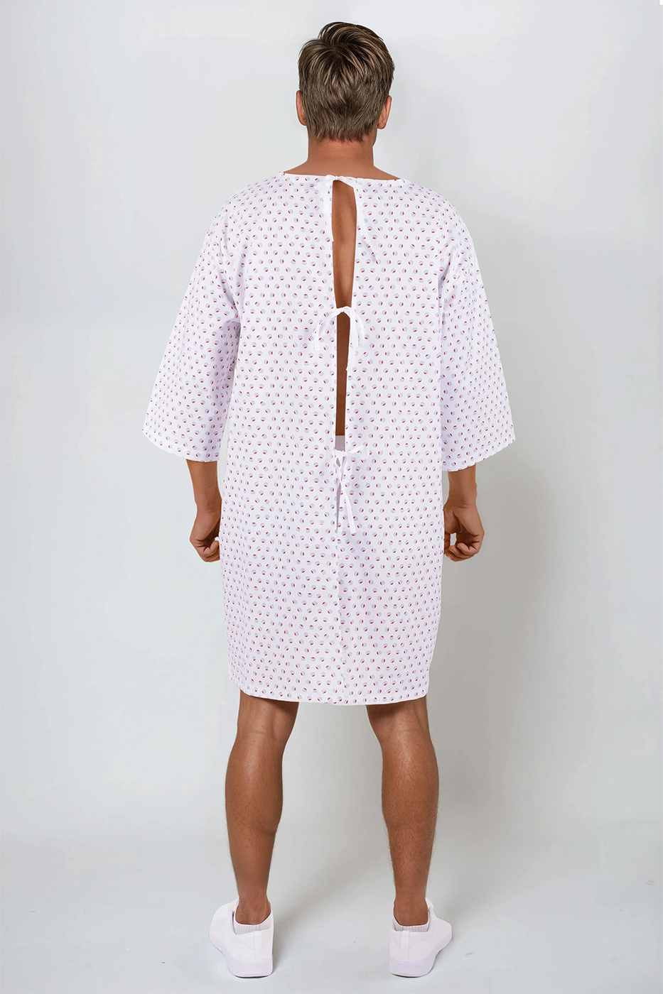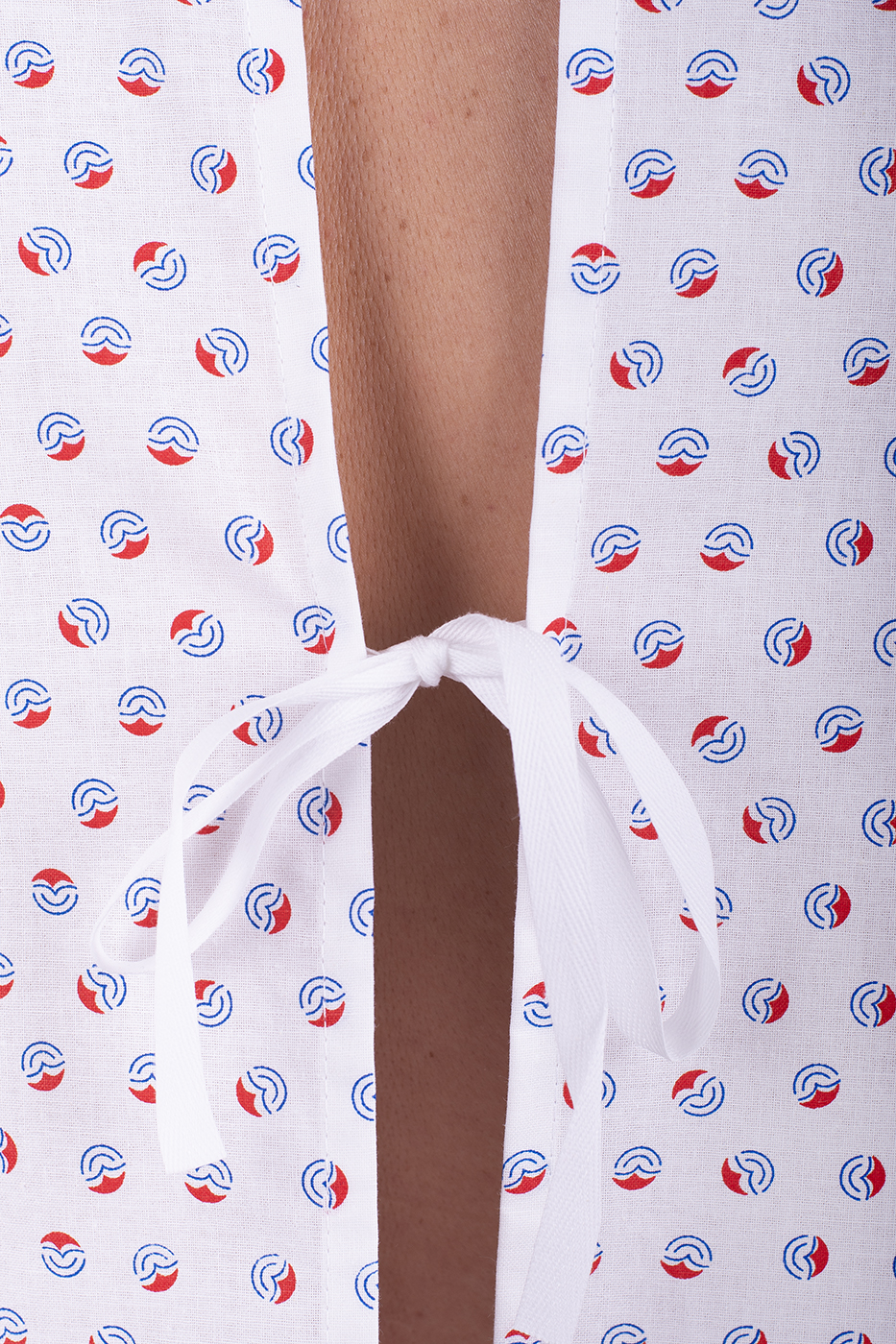 Košile pro pacienty Anděl červená/modrá fontána má v zadní části zavazování na tkanice a tříčtvrteční délku rukávů. Materiál: kvalitní vysrážená 100% bavlna s jemným vzorem.