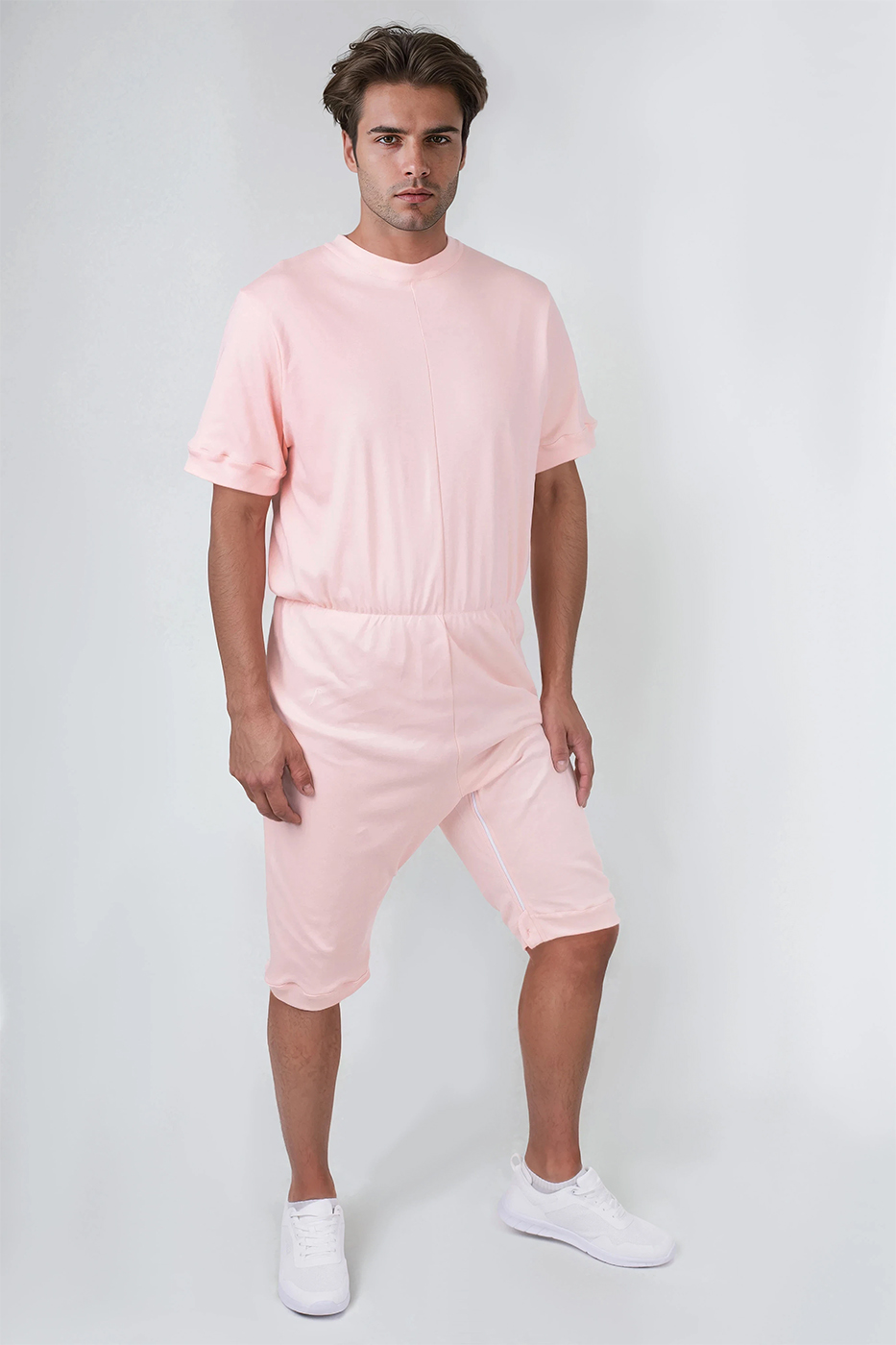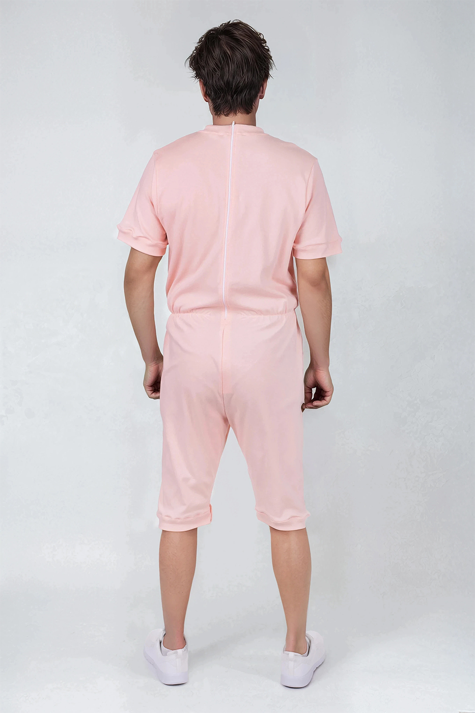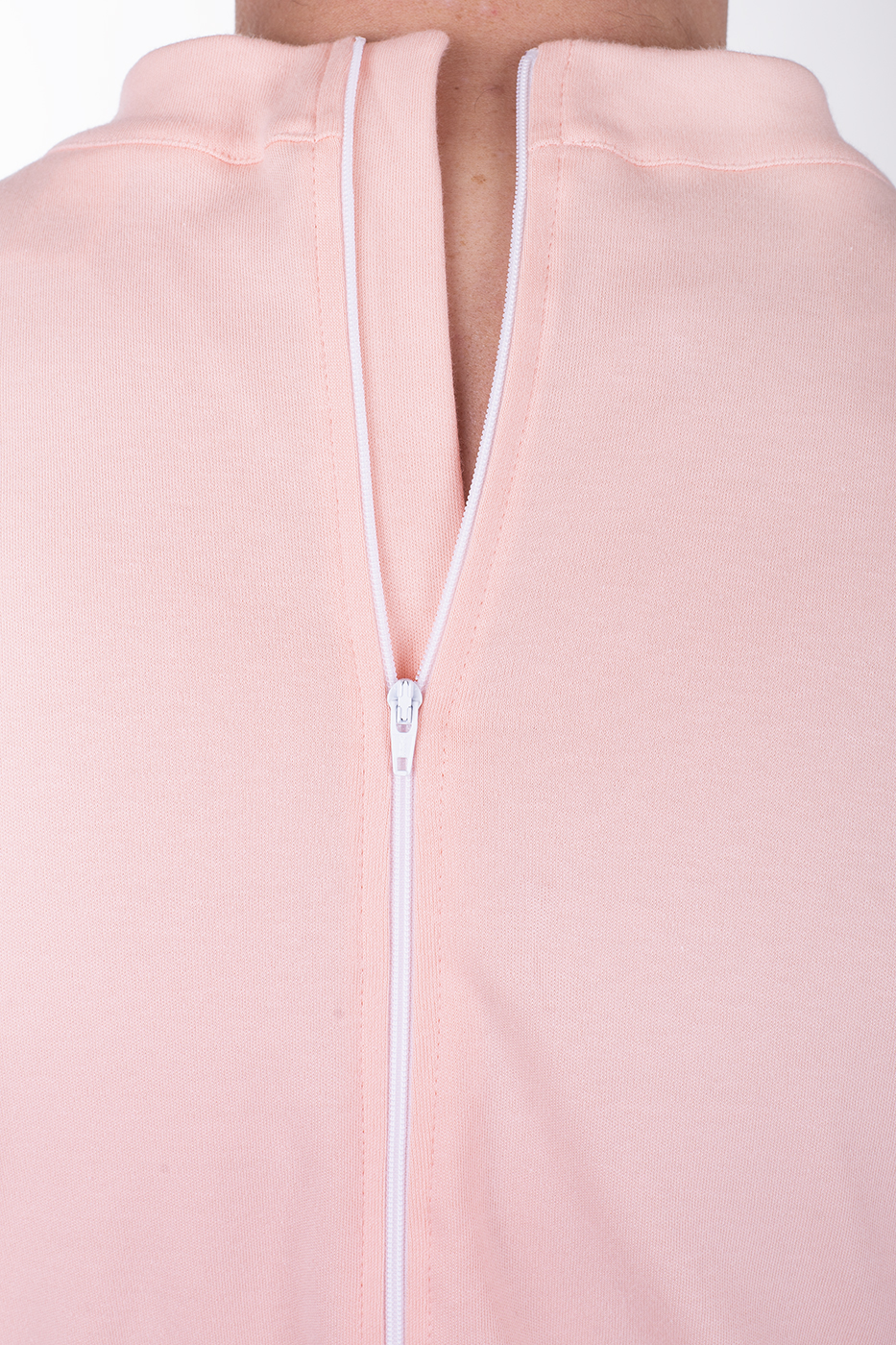 Overaly pro inkontinentní pacienty Inko Short meruňka se zipem v rozkroku. Jeden zip na zádech s krycí vnitřní légou vedoucí od krku pod pas. Druhý zip bez krycí vnitřní légy celopropínací vnitřní část nohavic. Bezpečnostní pojistka jezdce zipu nohavic proti rozepnutí.