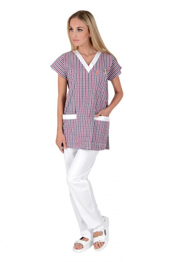 Pracovní halena s potiskem Unima K‑14516 je designově povedený kousek, který spojuje profesionální vzhled, pohodlný unisex střih a praktické vlastnosti, jež ocení každý den ve zdravotnictví, laboratoři nebo na pracovních provozech. Vzor jemné káro 14516 doplněný bílými lemováními kolem V‑výstřihu a kapes dodává haleně atraktivitu a individuální charakter, který zvýrazní osobitý styl každého pracovníka.