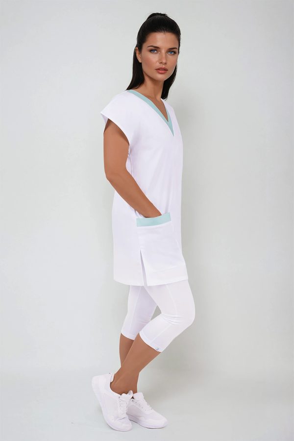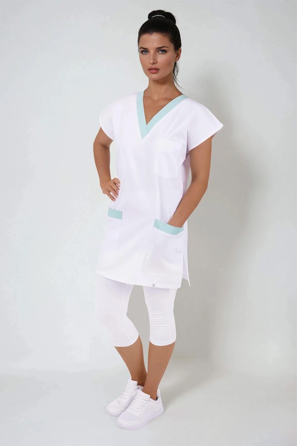 Barevné provedení v kombinaci klasické bílé a jemné mentolové působí svěže, čistě a profesionálně. Je to barevná kombinace, která je příjemná nejen pro nositele, ale i pro zákazníky, pacienty nebo kolegy. Stylový, ale přitom decentní vzhled činí tuto pracovní halenu vhodnou pro široké spektrum pracovních prostředí.
