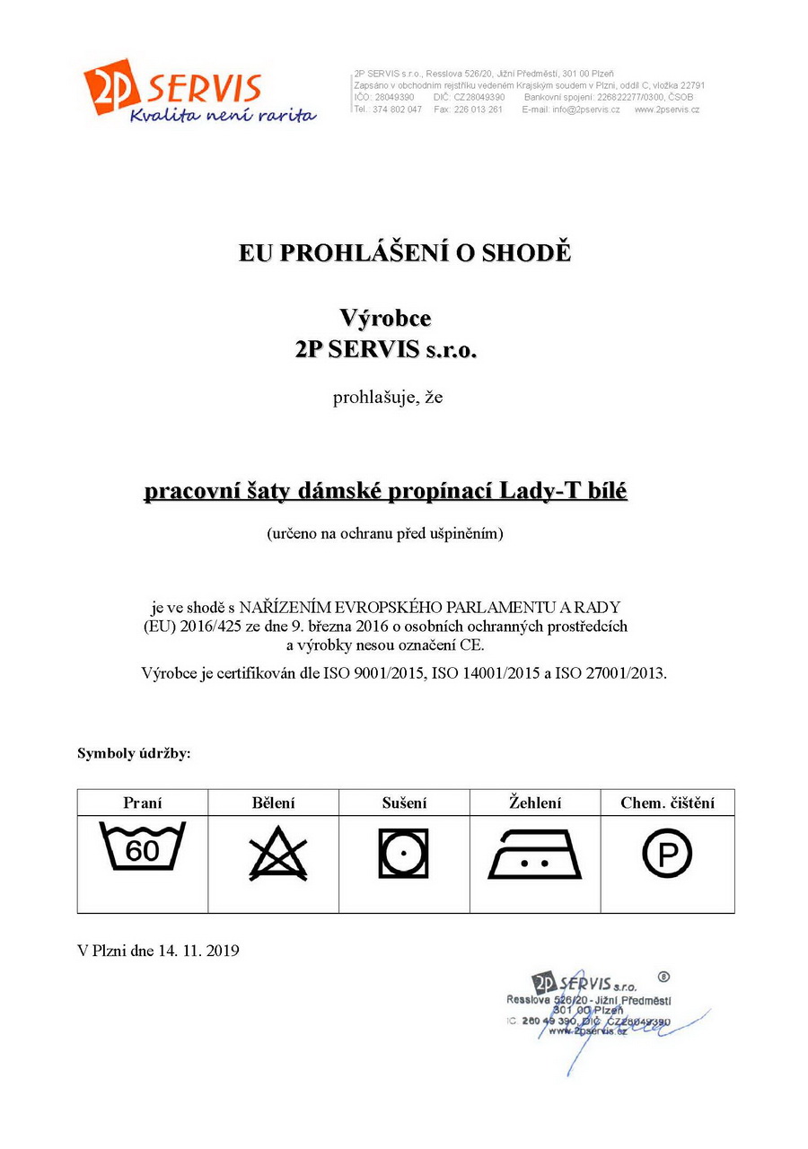 Pracovní šaty dámské propínací Lady-T mají mírně vypasovaný celopropínací střih se zapínáním na knoflíky, zdobení barevným sedlem, lemy krátkých rukávů a horních kapes, průkrčník zakončený límcem, zadní díl je hladký a na předním 4 nakládané kapsy, dolní kraj je rovný s krátkými bočními rozparky. Materiál: 50% bavlna, 50% PES, sanfor. 170g/m2. Praní: na 60°C.