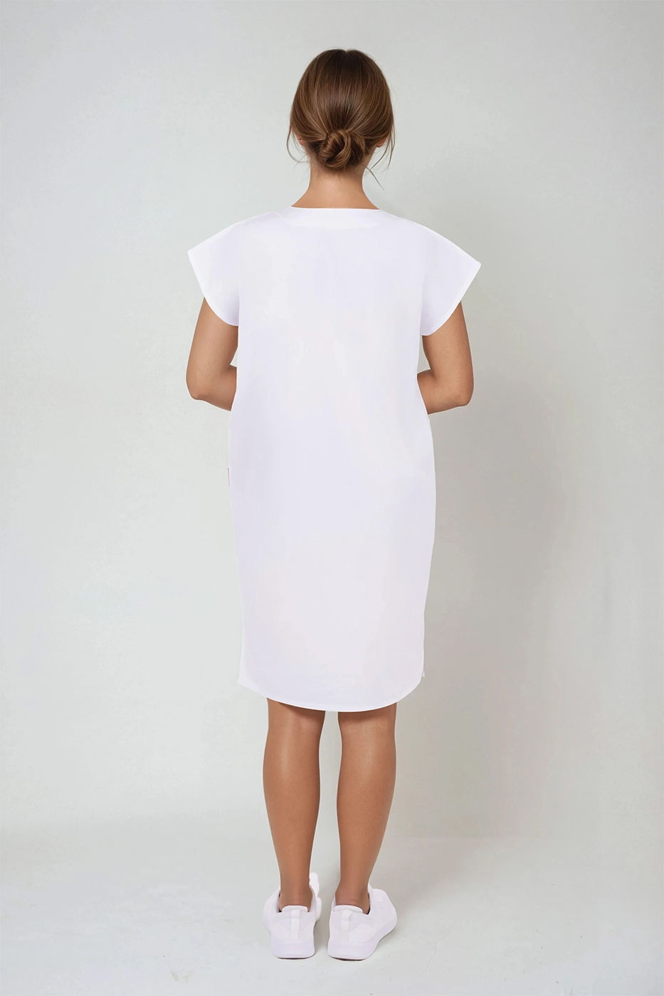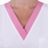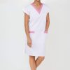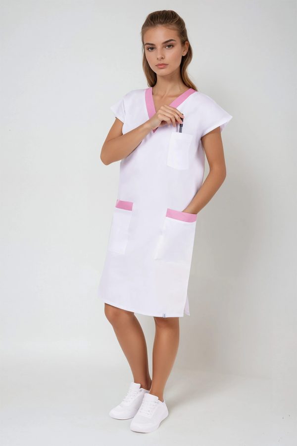 Pracovní šaty pro zdravotní sestry Prima Basic bílá/růžová jsou rovného, pohodlného střihu a výstřihem do V. Šaty mají 3 prostorné kapsy a pro snadnější pohyb jsou opatřeny v dolní části rozparky.
