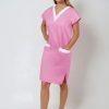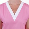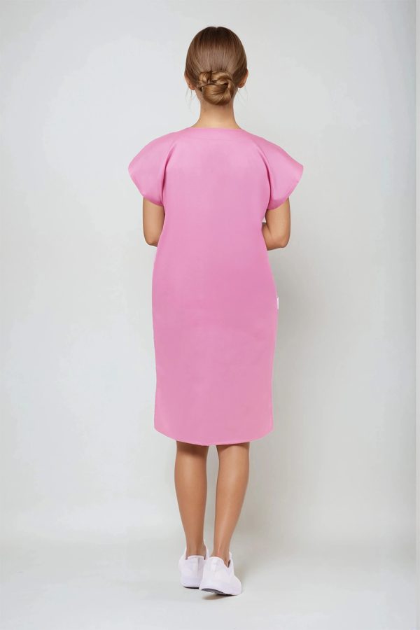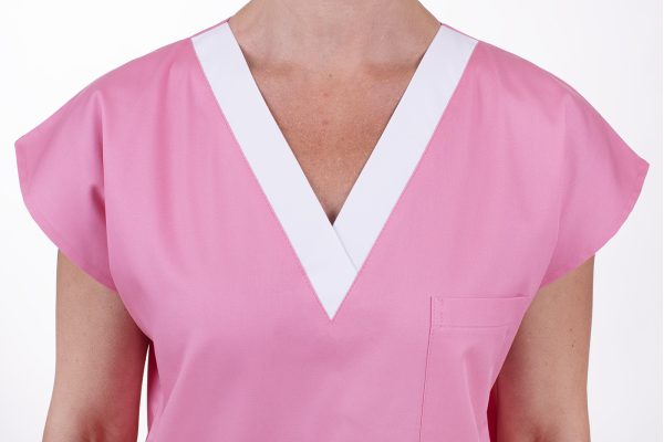 Střih šatů je rovný a pohodlný, navržený s ohledem na každodenní potřeby zdravotnického personálu. Výstřih do „V“ vypadá elegantně a zároveň zajišťuje příjemné odvětrání v oblasti krku. Výstřih do V umožňuje snadné oblékání a svlékání, což oceníte při střídání směn nebo při převlékání v zázemí pracoviště. Vše je navrženo tak, aby šaty respektovaly ženské křivky, ale zároveň neomezovaly v pohybu – ať už běháte po oddělení, nebo asistujete u zákroku.