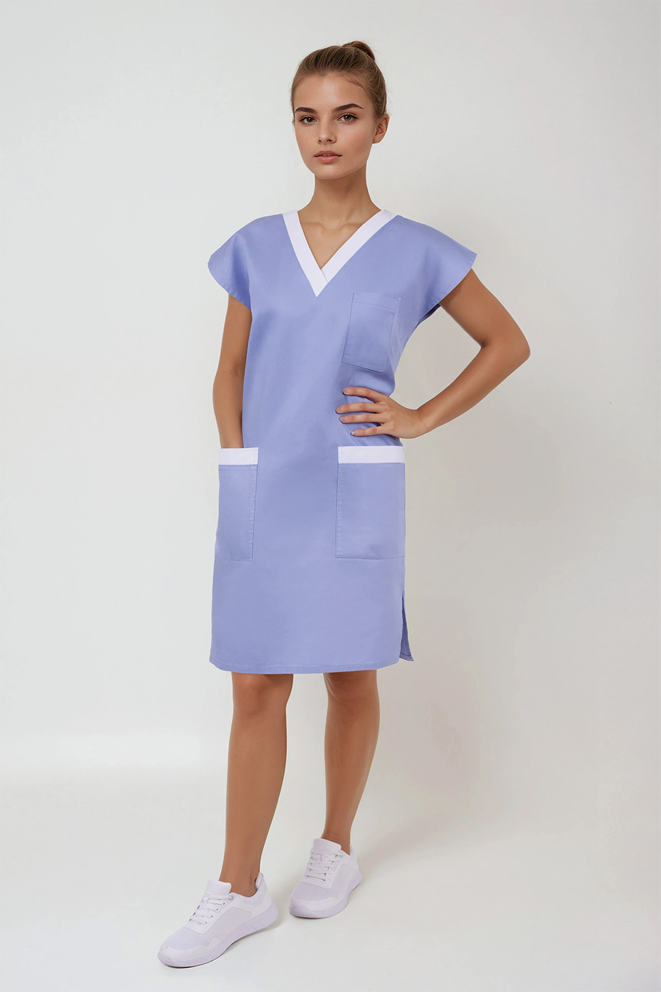 Modrá je v medicínském prostředí vnímána jako barva důvěry, klidu a profesionality. Světle modré provedení těchto šatů doplněné o bílé detaily působí čistě, jemně a příjemně na pohled – nejen pro kolegy a pacienty, ale i pro vás samotné. Tento design posiluje vaši autoritu a zároveň zachovává lidský a vstřícný dojem.