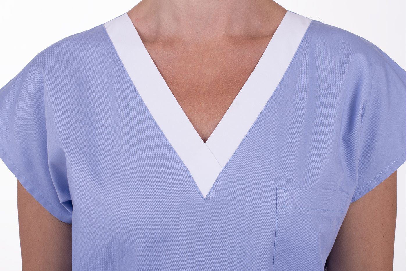 Výstřih do V působí elegantně a zároveň zajišťuje volnost v oblasti krku, což je zvláště příjemné v letních měsících nebo ve vyhřátých prostorách. Výstřih také přispívá k snadnému oblékání a svlékání přetažením přes hlavu, což oceníte zejména při střídání oděvů během směny nebo při častém převlékání kvůli hygienickým normám.