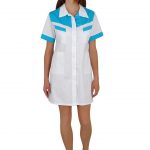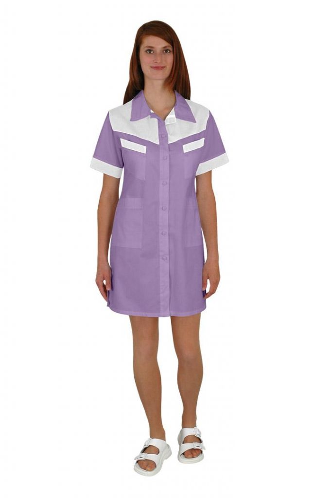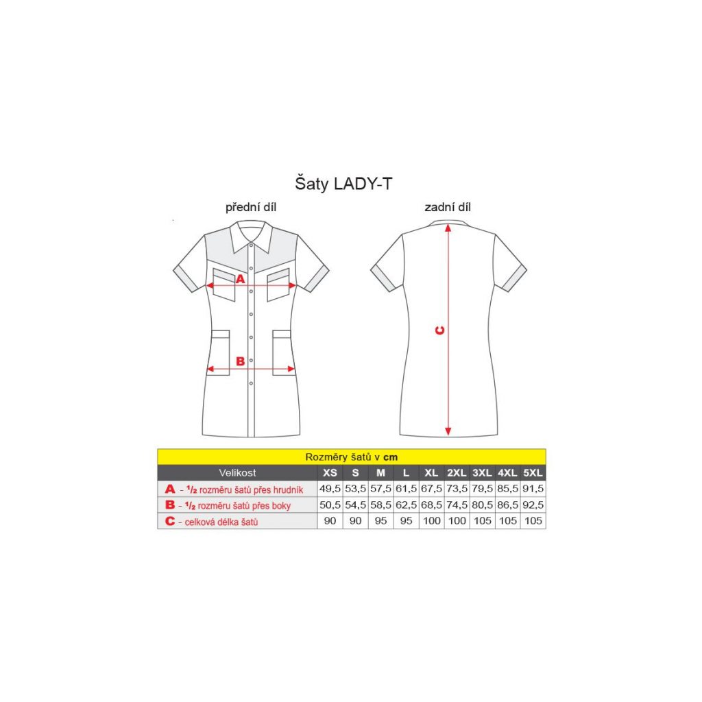Sesterské šaty pracovní Lady-T barevné s mírně vypasovaným celopropínacím střihem, zdobené barevným sedlem, lemy krátkých rukávů a horních kapes, průkrčník zakončený límcem, zadní díl je hladký a na předním 4 nakládané kapsy, dolní kraj je rovný a v bocích krátké rozparky. Materiál: 100% bavlna, sanfor., merc. 160g/m2. Praní: na 60°C.