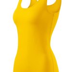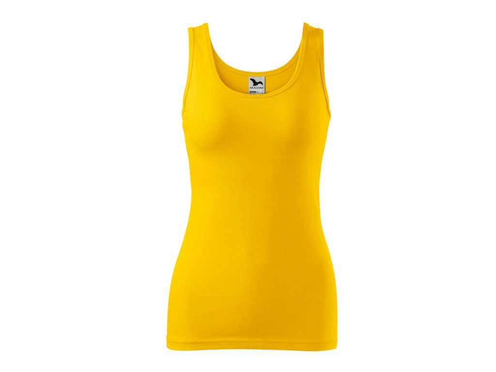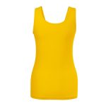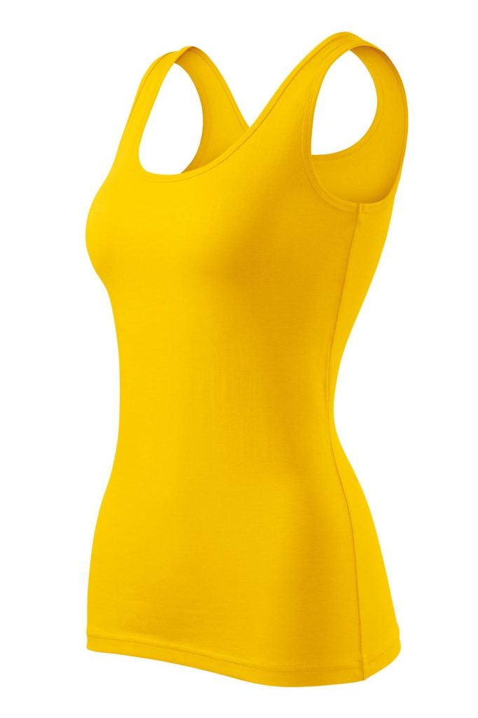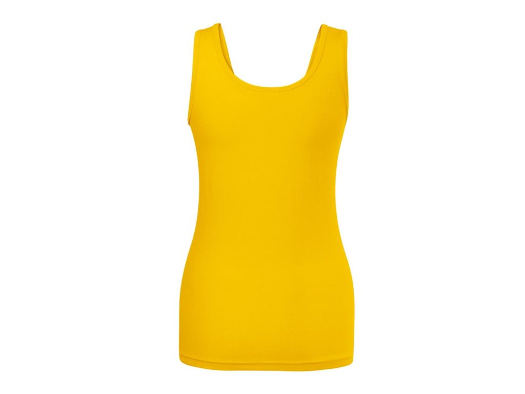 Dámské tílko Anna v žluté barvě má přiléhavý střih s bočními švy, strečový materiál udržující stálost tvaru, hlubší kulatý výstřih, průkrčník a průramky lemovány vrchovým materiálem, širší ramínka a saténová etiketa. Materiál: 95% bavlna 5% elastan 180g/m2. Praní: na 30°C.