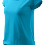 Tričko dámské tyrkysové TR-08 s širokým lemem v pase, s krátkými rukávy a volným střihem je opatřeno silikonovou úpravou, dík které je vhodné pro digitální potisk, výšivku, přímý sítotisk a transférový potisk. Materiál: 100% bavlna 150g/m2. Praní: 40°C.
