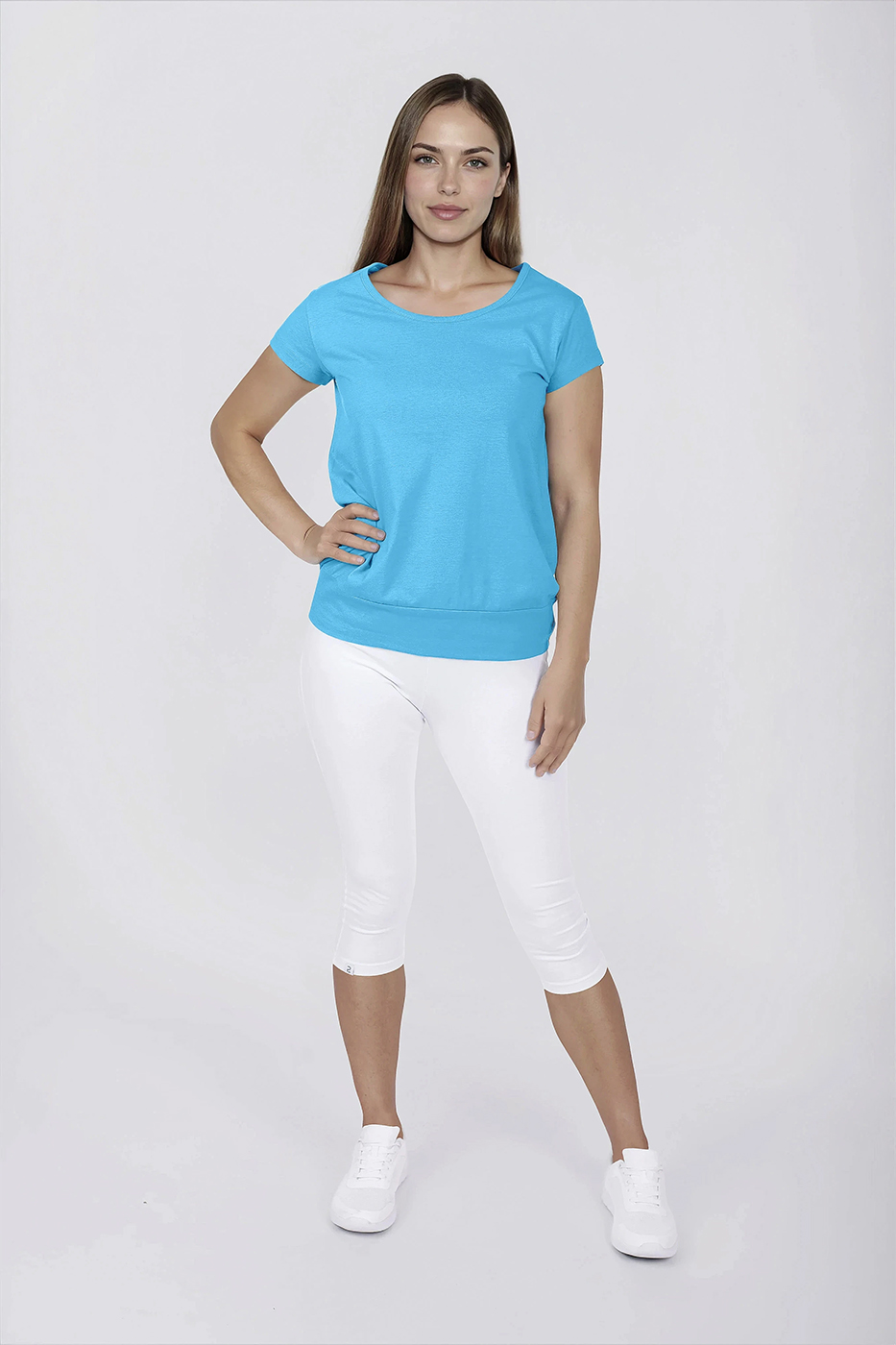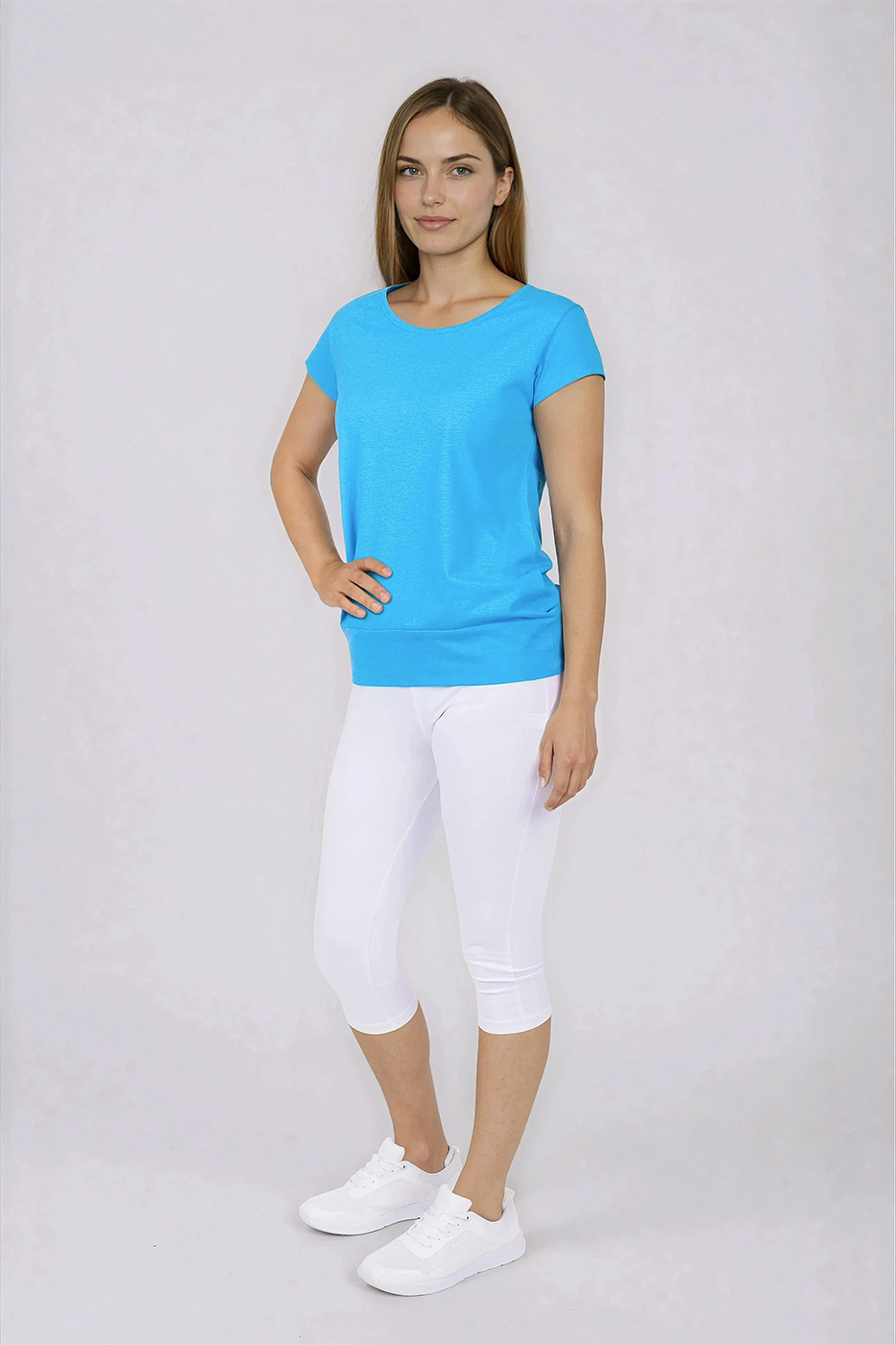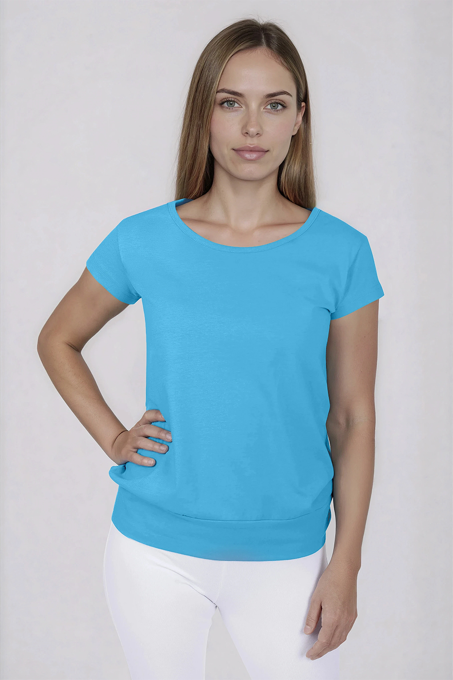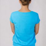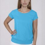 Tričko dámské tyrkysové TR-08 s širokým lemem v pase, s krátkými rukávy a volným střihem je opatřeno silikonovou úpravou, dík které je vhodné pro digitální potisk, výšivku, přímý sítotisk a transférový potisk. Materiál: 100% bavlna 150g/m2. Praní: 40°C.