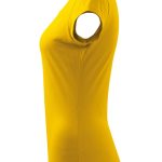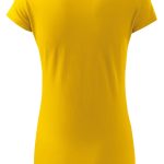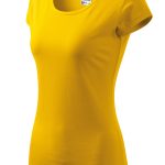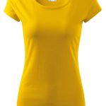 Moderní dámské tričko žluté barvy s velmi krátkým rukávem, kulatým průkrčníkem s olemováním, ramena zpevněná všitým proužkem, projmutým střihem k bokům zvýrazňujícím dámskou siluetu, exkluzivním vzhledem dík finální silikonové úpravě. Materiál: 100% bavlna, 150g/m2. Praní: na 40°C.