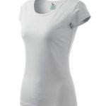 Moderní dámské tričko bílé barvy s velmi krátkým rukávem, kulatým průkrčníkem s olemováním, ramena zpevněná všitým proužkem, projmutým střihem k bokům zvýrazňujícím dámskou siluetu, exkluzivním vzhledem dík finální silikonové úpravě. Materiál: 100% bavlna, 150g/m2. Praní: na 40°C.- jemný, prodyšný na omak příjemný materiál