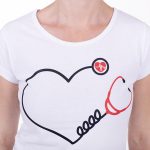 Představujeme vám dámské triko z příjemného materiálu, které je svým potiskem vyloženě předurčené k použití ve zdravotnictví. Obrázek stetoskopu a srdce na bílém triku je nejen hezký, ale především kvalitní. Triko lehce projmutého střihu, který zvýrazní ženskou postavu, je vyrobeno ze 100% bavlny. Příjemný materiál výborně saje pot, je prodyšný a nezpůsobuje alergie. V teplých dnech nebo v teplých provozech uvítáte velmi krátké rukávy. Slušet vám bude i kulatý výstřih.